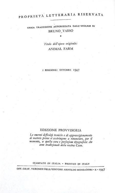 La fattoria degli animali. Milano, Arnoldo Mondadori editore, 1947 (Ottobre).