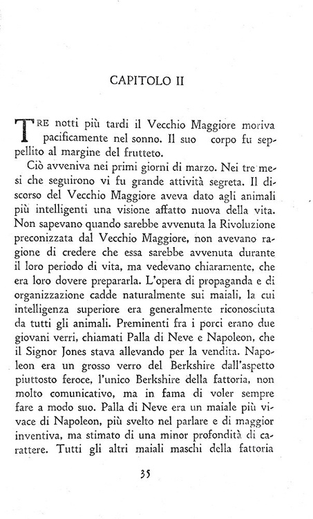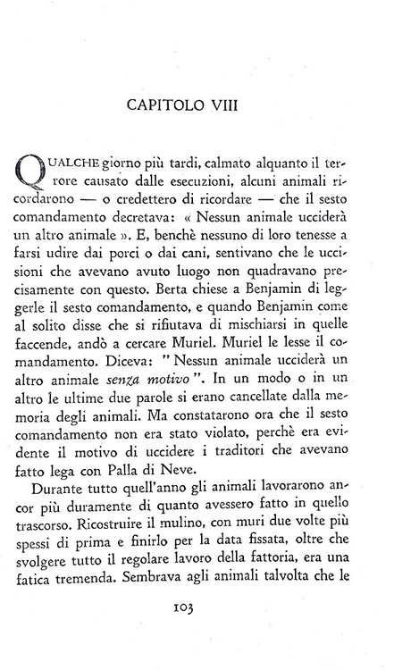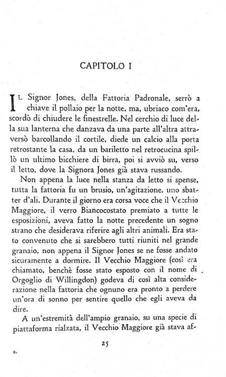 Cm. 19,5 pp. 144 (4). Brossura editoriale. Dedica manoscritta di mano coeva all'occhietto. Lievi segni del tempo alla fragile brossura, ordinaria patina del tempo alle pagine dovuta anche alla difficoltà di stampa nel periodo post-bellico (come si evince anche dall'avviso dell'editore nel retro del frontespizio). Esemplare nel genuibo e in buono stato di conservazione. "È una satira contro il regime comunista secondo modi tradizionali che richiamano Swift. Gli animali di una fattoria, stanchi della supremazia dell'uomo, lo scacciano e si organizzano sulla base di un governo democratico che, nel volger di pochissimo tempo, diventa una ferrea dittatura" (Mondadori 1959: vol. III, pag. 908)". Traduzione di Bruno Tasso. Prefazione di Giorgio Monicelli. Non comune e ricercata prima edizione italiana. Collana Medusa, vol. 200. Cfr. Iccu.