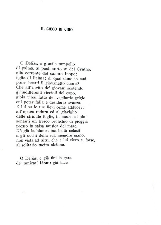 Cm. 22,5, pp. (2) xiv, 214 (2) [completo delle due carte bianche poste all'inizio e alla fine]. Gradevole legatura del tempo in mezza pelle; dorso a 5 nervi con titoli in oro e ampie punte. Taglio di testa rosso. Brossura originale conservata (entrambi i piatti) illustrata da Adolfo de Carolis. Sporadiche e trascurabili fioriture. Esemplare fresco e ben conservato, ancora in barbe e a margini diseguali. Stampato su carta forte. Importante raccolta di componimenti pascoliani, in parte originale: risultano stampate qui per la prima volta le sezioni «L'ultimo viaggio», «Il poeta degli iloti», «Poemi di Psyche», «I vecchi di Ceo» e i componimenti «Letèra e «La madre», allinterno dei «Poemi di Ate». Gli altri poemi erano invece già usciti in rivista, in particolare su «Il convito», «La Vita Italiana», «Marzocco», «Nuova Antologia», «Flegrea», «Illustrazione Italiana» e «Atene e Roma». Non comune prima edizione, in parte originale; sesto volume delle «Poesie di Giovanni Pascoli». Nella seconda e definitiva edizione del 1905 venne inserito solo il poema «I gemelli». Cfr. Iccu; Gambetti - Vezzosi, Rarità bibliografiche del Novecento italiano, p. 644 “abbastanza ricercato”.