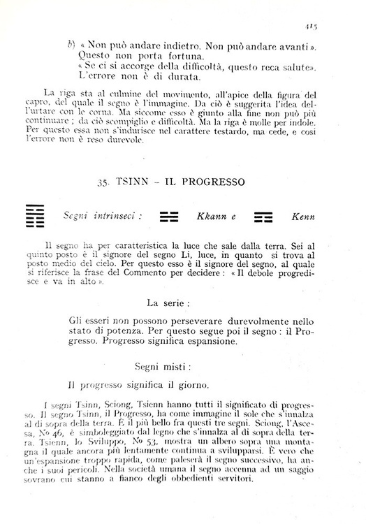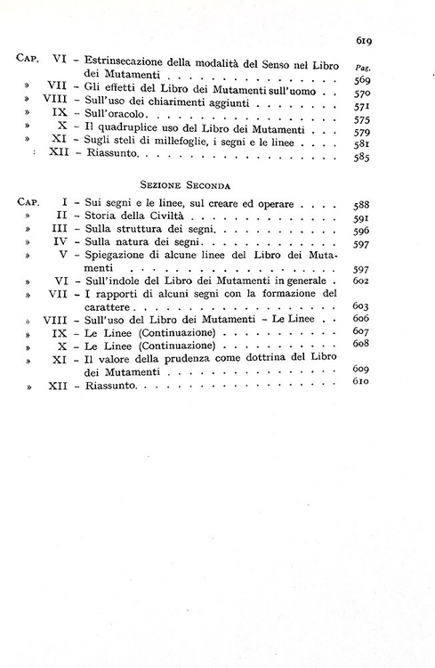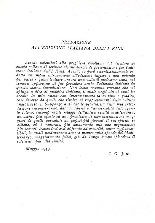 Cm. 21,5, pp. 619 (1). Con decine di simboli n.t. Brossura editoriale. Esemplare ottimamente conservato. Il libro dei mutamenti (circa X secolo a.C.), conosciuto anche come Zhou Yi,"I mutamenti della dinastia Zhou", è ritenuto il primo dei testi classici cinesi sin da prima della nascita dell'impero cinese. È sopravvissuto alla distruzione delle biblioteche operata dal primo imperatore, Qin Shi Huang Di. Un oracolo affascinante che, aiutando il lettore a "fare ciò che è giusto in concordanza con la legge celeste", gli schiude un nuovo modo di rapportarsi con se stesso e gli eventi esterni. Una delle vette più alte mai raggiunte dalla spiritualità cinese. Collana “Psiche e coscienza”, nr. 14. Prima edizione italiana. Traduzione dalla versione tedesca di Richard Wilhelm a cura di Bruno Veneziani e A.G. Ferrara. Prefazione all'edizione italiana di Carl Gustav Jung che cercava il modo di definire quegli aspetti dell'inconscio non riconducibili alla storia individuale perché collegati, essendo comuni, all'intera umanità. Cfr. Iccu.