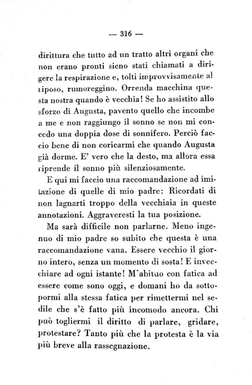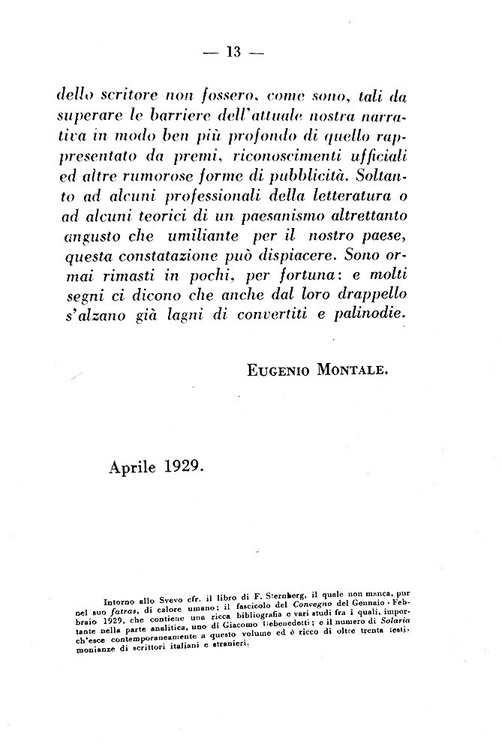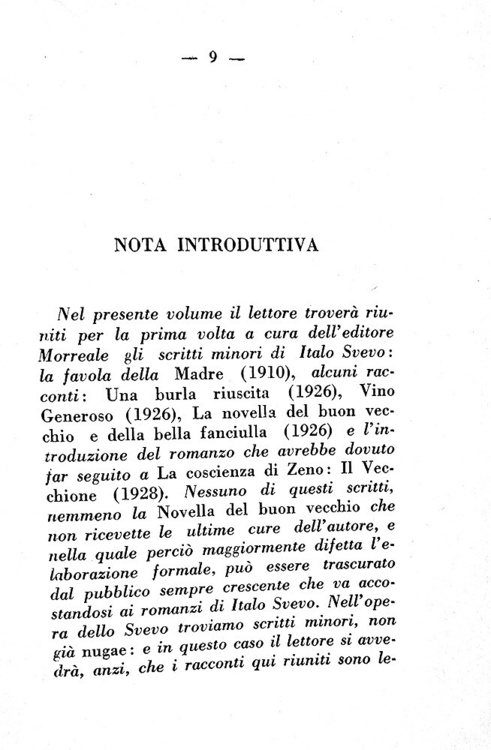 Cm. 19,5, pp. 316 (4). Brossura editoriale con titolo in rosso e nero. Trascurabili segni del tempo alla brossura e oridinaria patina del tempo alle estremità delle pagine. Esemplare nel complesso ben conservato. Questa edizione raccoglie per la prima volta gli scritti minori o dispersi di Italo Svevo: "La novella del buon vecchio e della bella fanciulla" (1926), "Vino generoso" (1926), "Una burla riuscita" (1926), "La madre" (1910) e infine l'introduzione del romanzo che avrebbe dovuto far seguito a La coscienza di Zeno ovvero "Il vecchione" (1928). Nella breve e autorevole introduzione Eugenio Montale, primo grande critico italiano dell'opera sveviana, non esita a definire lo scrittore triestino "il maggior romanziere che abbia dato la nostra letteratura dai tempi del Verga fino a oggi". Ricercata prima edizione. Cfr. Iccu; Gambetti-Vezzosi, Rarità bibliografiche del Novecento italiano, p. 461: “piuttosto ricercato”.