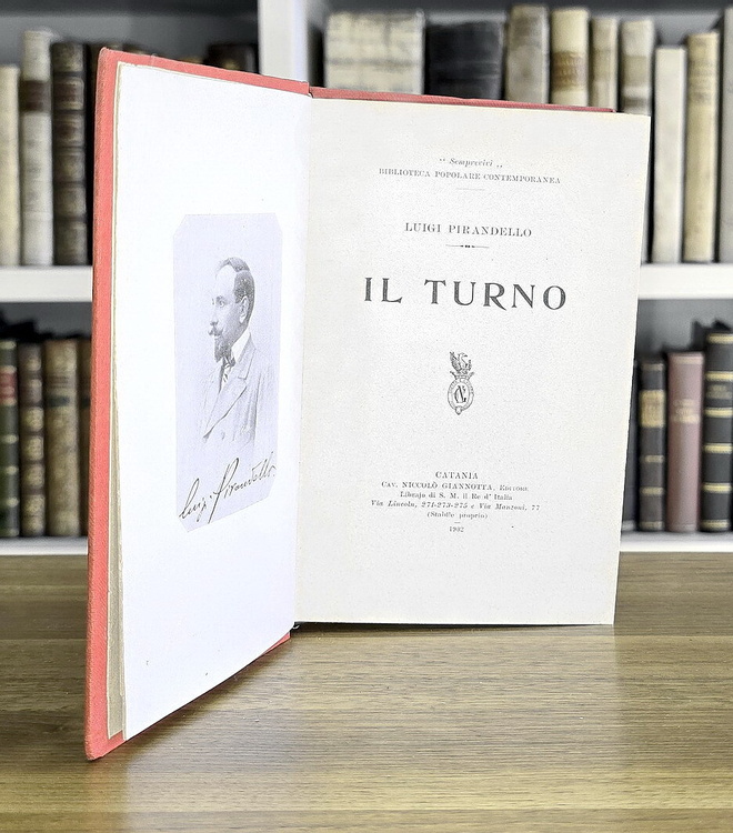Cm. 17, pp. (8) 174 + 1 carta bianca. Con un bel ritratto fotografico dell'Autore in antiporta. Legatura strettamente coeva in piena tela rossa con titoli in oro al dorso. Esemplare fresco e ben conservato. Secondo romanzo del grande scrittore siciliano (1867-1936) ma primo pubblicato in volume («L'esclusa» appare su «La Tribuna» nel 1901, in volume solo nel 1908). Il turno fu una delle opere pirandelliane più ripubblicate già all'epoca, con anche una traduzione spagnola nel 1920. Il romanzo è«centrato su uno dei grandi temi pirandelliani, il caso-caos» (Simona Costa, voce DBI). Fu trasposto in cinema nel 1981 da Tonino Cervi. Rara e ricercata prima edizione pubblicata nella Collana Semprevivi - Biblioteca Popolare Contemporanea, n. 37. Cfr. Gambetti / Vezzosi, p. 687 “Abbastanza raro e piuttosto ricercato”; Lo Vecchio Musti, p. 27.