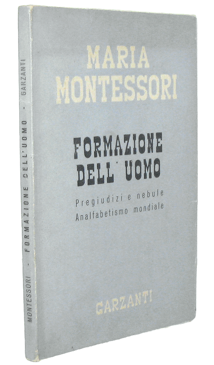 Cm. 18,5, pp. (4) 134 (2). Brossura editoriale azzurrina (protetta da velina) con ampi risvolti. Trascurabili segni del tempo. Esemplare nel complesso fresco e ben conservato. “Formazione dell'uomo” è una lettura fondamentale per chiunque desideri comprendere la profondità del pensiero pedagogico di Maria Montessori (1870-1952). Sono riuniti, in questo volume, due distinti saggi. Con “Pregiudizi e nebule”, attacca la tradizione stanca a cui si aggrappa ancora la società, che perdura in un'ignoranza assoluta del bambino, delle sue esigenze e delle sue grandi possibilità. Invoca nuovi rapporti di amore vero e di rispetto fra l'adulto e il bambino. In “Analfabetismo mondiale”, forte dell'esperienza condotta nel suo apostolato educativo in India, la Montessori rivela il fenomeno miracoloso della scrittura come conquista gioiosa del bambino dai 4 ai 6 anni, conquista che apre la via ad altre incancellabili acquisizioni intellettuali. Ricercata prima edizione. Cfr. Iccu.