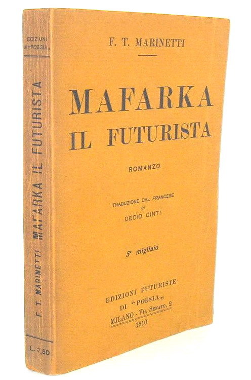 Cm. 18,5, pp. 329 (7). Brossura editoriale di colore giallo ocra. Con indicazione di «5° migliaio» in copertina (tiratura non menzionata in Gambetti-Vezzosi). Trascurabili pieghette, ordinaria patina del tempo. Esemplare nel complesso fresco e ben conservato. È la prima opera ufficialmente futurista di Marinetti, scritta nel periodo in cui l'Autore concepiva e componeva il primo Manifesto del futurismo. Come tutte le opere di Marinetti fino al 1912, fu scritta in francese e tradotta in italiano l'anno successivo, nel 1910, da Decio Cinti. Il testo, ambientato in un'Africa immaginaria, narra le epiche avventure di Mafarka, che dopo aver trionfato sui suoi nemici in battaglia, in luogo di proclamarsi re degli africani decide di ritirarsi e dedicarsi alla 'creazione' di suo figlio, Gazurmah. Celebre e ricercata prima edizione italiana. Il romanzo fu sequestrato nei primi giorni di aprile e sottoposto a processo per oltraggio al pudore; dopo una prima assoluzione nellottobre dello stesso anno, il romanzo fu condannato definitivamente in appello: l'Autore fu condannato a due anni di prigione, «che però si risolsero in una multa e nel divieto di far circolare l'opera. L'edizione successiva apparve infatti in forma purgata (Sonzogno, 1920)» (Cfr. Salaris, Marinetti Editore, pp. 105-111). Cfr. Gambetti-Vezzosi, Rarità bibliografiche del Novecento italiano, p. 514: “Esistono copie con l'indicazione di 2°, 7°, 10°, 13° e 14° migliaio”; Cammarota, Marinetti, 24; Iccu.