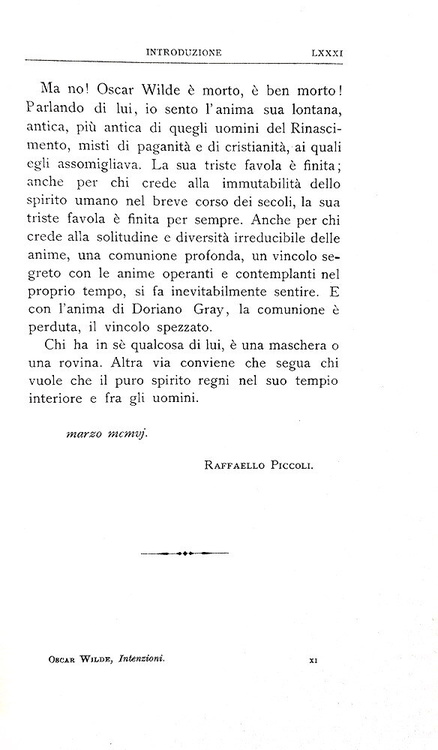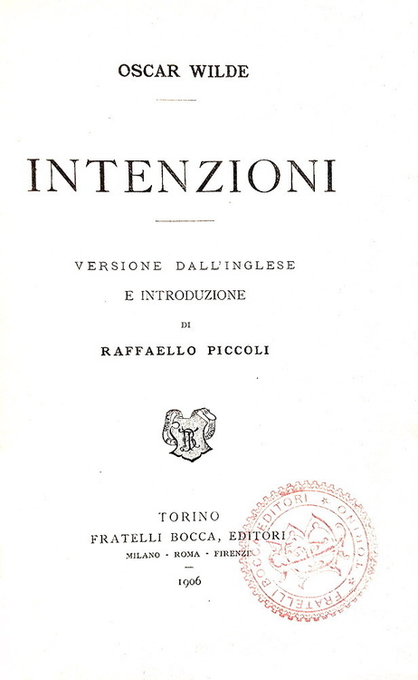 Intenzioni. Versione dall'inglese e introduzione di Raffello Piccoli. Torino, Fratelli Bocca Editori, 1906.