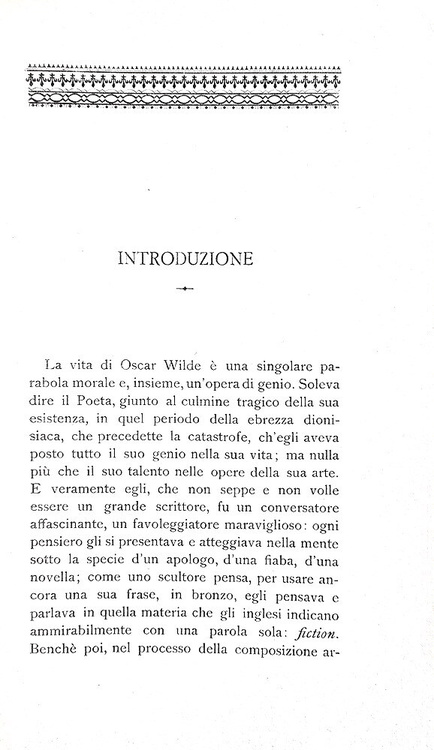 Cm. 20,5, pp. lxxxviii, 267 (5). Brossura editoriale illustrata con il ritratto di Oscar Wilde al tratto. Timbro in rosso dell'editore Bocca al piatto anteriore della brossura e al frontespizio. Trascurabili bruniture/fioriture alla brussura, peraltro esemplare fresco e ben conservato. Intenzioni (titolo originale: Intentions) è un saggio di Oscar Wilde del 1891. L'opera fu prima pubblicata con il titolo di "The Decay of Lying", completato per la prima stesura nel dicembre 1888 e pubblicato nel gennaio 1889 su Nineteenth Century. Invece l'altra parte dell'opera, The Critic as Artist fu inizialmente pubblicata sulla stessa rivista a luglio e settembre del 1890. La stesura definitiva on l'aggiunta di due saggi fu appuntopubblicata nel 1891 sotto il nome di Intentions. Nell'opera si osserva dell'importanza dell'immaginazione a discapito della ragione, la prima riusciva ad aver la meglio sulla seconda nell'operato degli esseri umani. Nella lettura dell'opera si osserva di come l'Autore riesca ad esprimere il rifiuto della sincerità, a dare ampio sfoggio alla potenzialità delle espressioni dei paradossi, esternando tutto ciò che pensava. Elenco dei saggi con i titoli in lingua italiana: La decadenza del mentire; Penna, matita e veleno; Il critico come artista; La verità delle maschere. Con una dettagliata bibliografia delle prime edizioni di Wilde in calce all'introduzione. Prima edizione italiana. Cfr. Iccu.