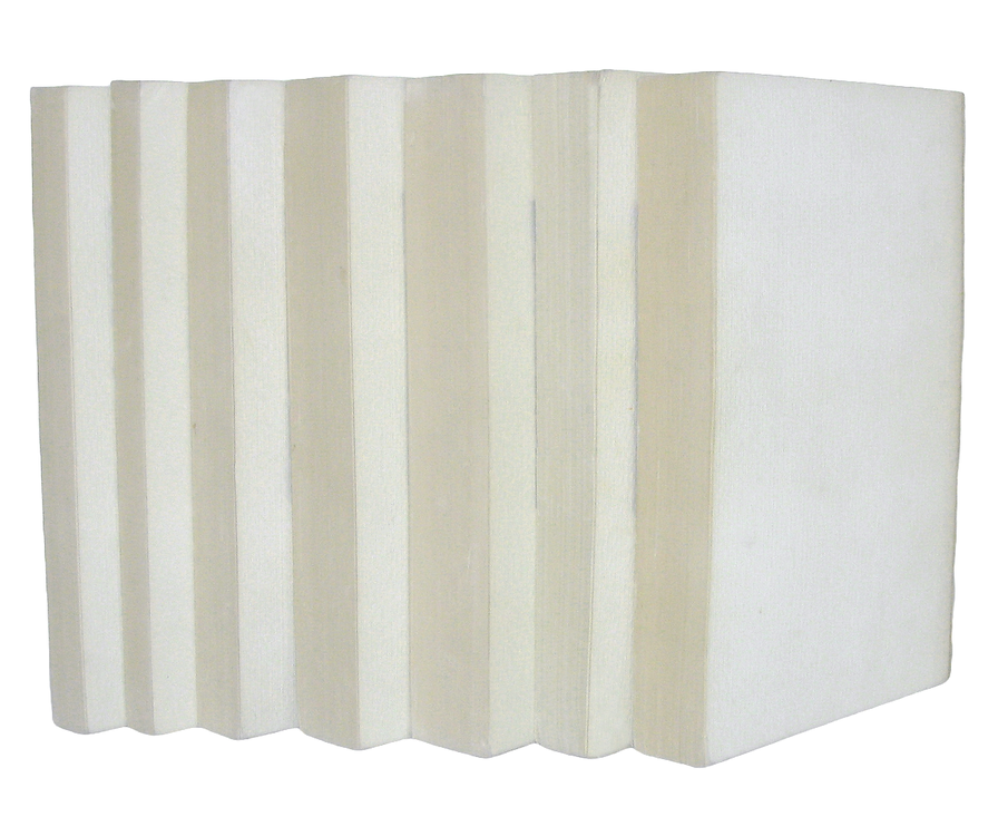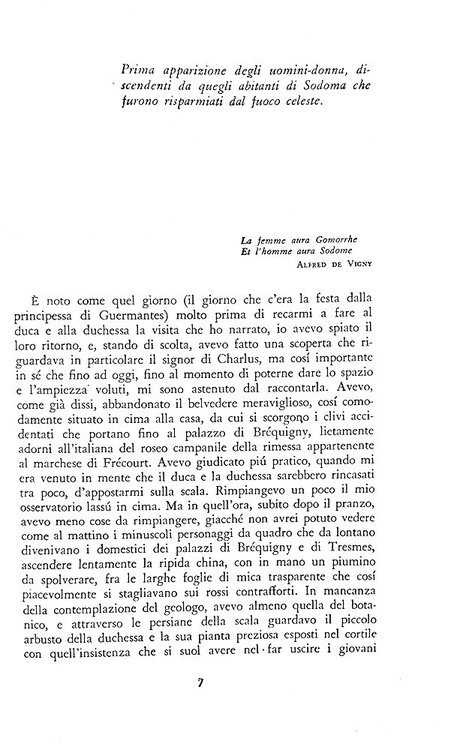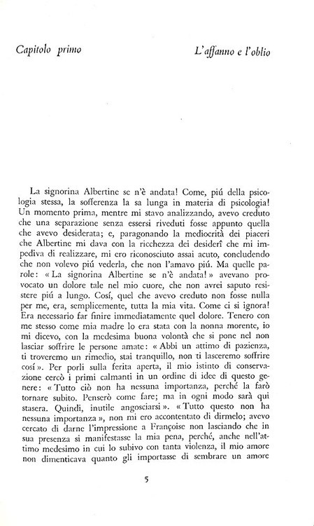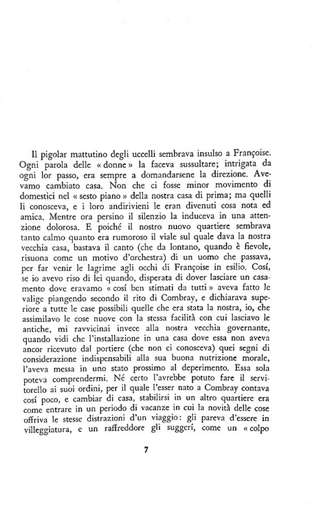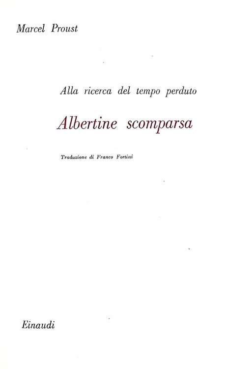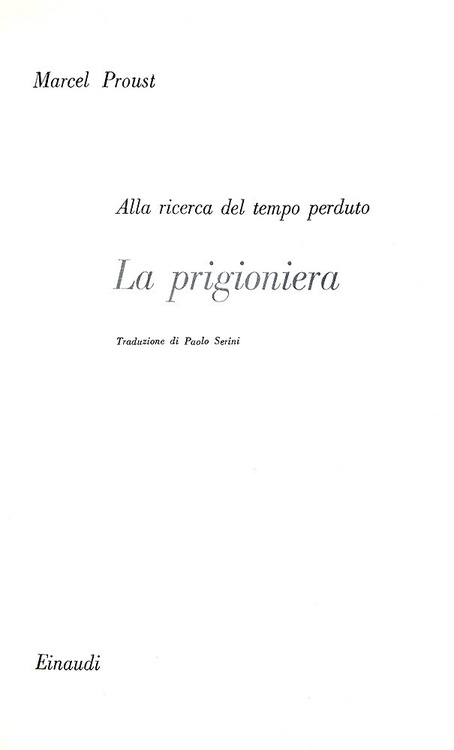 Sette volumi di cm. 22, pp. 406 (4); 499 (5); 561 (1); 510 (6); 380 (4); 253 (3); 336 (6). Tassellini del prezzo ancora presenti e applicati al contropiatto posteriore; alcuni volumi conservano ancora la scheda editoriale all'interno. Legatura editoriale in cartoncino illustrato ai piatti con dorso in tela. Trascurabili/fisiologici segni del tempo. Esemplare nel complesso fresco e ben conservato. Alla ricerca del tempo perduto (titolo originale À la recherche du temps perdu, nota anche col titolo accorciato La Recherche) è un romanzo di Marcel Proust (1871-1922), scritto tra il 1906 e il 1922, pubblicato in sette volumi tra il 1913 e il 1927, dei quali gli ultimi tre postumi. Più che la narrazione di una sequenza ordinata di avvenimenti, l'opera s'interessa a una riflessione psicologica sulla letteratura, sulla memoria e sul tempo; tali elementi, apparentemente sparsi, si trovano legati gli uni agli altri, quando, attraverso le sue esperienze, positive e negative, il narratore - vero eroe del romanzo - scopre il senso ultimo della vita nell'arte e nella letteratura, nell'ultimo tomo. Dettaglio delle singole parti dell'opera: 1) La strada di Swann (traduzione di Natalia Ginzburg - Du côté de chez Swann, 1913); 2) All'ombra delle fanciulle in fiore (traduzione di Franco Calamandrei e Nicoletta Neri - À l'ombre des jeunes filles en fleurs, 1919); 3) I Guermantes (traduzione di Mario Bonfantini - Le côté de Guermantes, 1920); 4) Sodoma e Gomorra (traduzione di Elena Giolitti - Sodome et Gomorrhe, 1921-1922); 5) La prigioniera (traduzione di Paolo Serini - La prisonnière, 1923); 6) Albertine scomparsa (traduzione di Franco Fortini - Albertine disparue, 1925); 7) Il tempo ritrovato (traduzione di Giorgio Caproni - Le temps retrouvé, 1927). Collana I Supercoralli. Non comune e ricercato ensemble di tutti i volumi del capolavoro proustiano; alcuni tomi sono in seconda edizione italiana integrale, altri in terza, tutto stampati nel 1952, dopo la prima Einaudi del 1946/51. Cfr. Iccu.