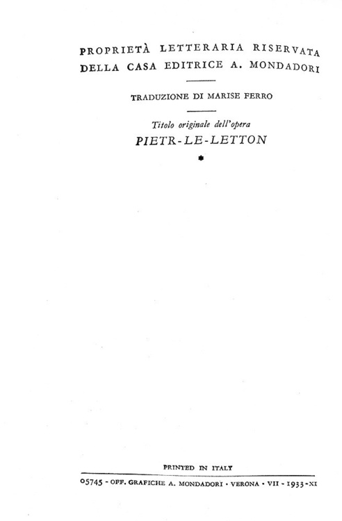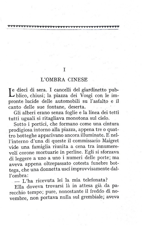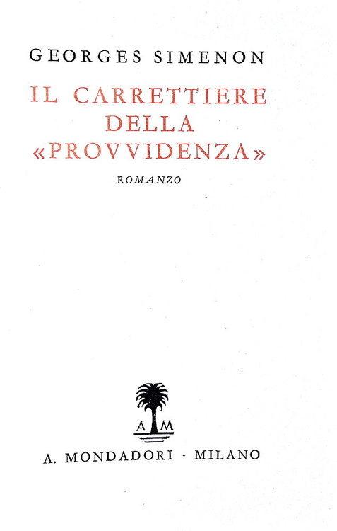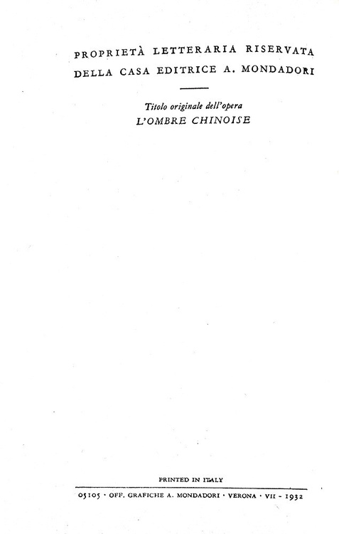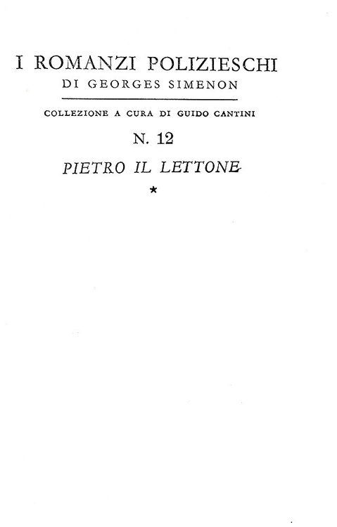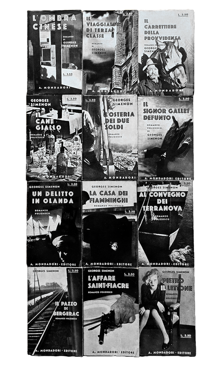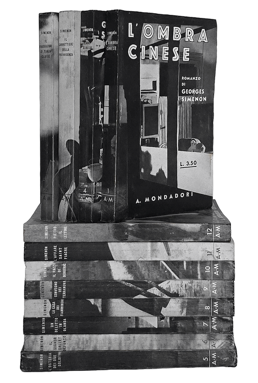 Dodici volumi di cm. 18,5. Brossura editoriale illustrata in bianco e nero. Trascurabili segni del tempo alle brossure di tonalità nera, sporadiche/lievi arrossature alle carte inziali e finali, peraltro volumi internamente contraddistinti da carta inusualmente fresca per questa tipologia di edizione. Ottimi esemplari, che si distinguonono dalla quasi totalità delle copie reperibili nel mercato, spesso interessate da difetti alle fragili brossure. Dettaglio dei titoli di questa leggendaria collana, rarissima da trovarsi completa dei dodici volumi. Numero 1: L'ombra cinese (L'ombre chinoise), settembre 1932, pp. 192, traduzione di Guido Cantini; numero 2: Il viaggiatore di terza classe (Le pendu de Saint Pholien), settembre 1932 pp. 197 (3), traduzione di Guido Cantini; numero 3: Il carrettiere della provvidenza (Le Charretier de "La Providence"), 1932, pp. 198, traduzione di Guido Cantini; numero 4: Il cane giallo (Le chien jaune), novembre 1932. pp. 204, traduzione di Guido Cantini; numero 5: L'osteria dei due soldi (La guinguette à deux sous), dicembre 1932, pp. 174, traduzione di Alberto Tedeschi; numero 6: . Il signor Gallet defunto (M. Gallet décédé), gennaio 1933, pp. 181 (1), traduzione di Guido Cantini; numero 7: Un delitto in Olanda (Un crime en Hollande), febbraio 1933, pp. 189 (3), traduzione di Guido Cantini; numero 8: La casa dei fiamminghi (Chez les Flamands), marzo 1933, pp. 198, traduzione di Marise Ferro; numero 9: Al convegno dei Terranova (Au rendez-vous des Terre-Neuvas"), aprile 1933, pp. 189 (3), traduzione di Guido Cantini; numero 10: Il pazzo di Bergerac (Le fou de Bergerac), maggio 1933, pp. 222, traduzione di Marise Ferro; numero 11: L'affare Saint-Fiacre (L'affaire Saint-Fiacre), giugno 1933, pp. 174, traduzione di Guido Cantini; numero 12: Pietro il lettone (Pietr-le-Letton), luglio 1933, pp. 190 (2), traduzione di Marise Ferro. Nel 1932 la casa editrice Arnoldo Mondadori di Verona acquista tutti i diritti di pubblicazione in Italia delle opere di Georges Simenon, che, dal 1930, ha iniziato a scrivere sotto il suo vero nome e "lanciato", con Pietr-le Letton, il primo dei 76 romanzi con Jules Maigret commissario e protagonista: è l'inizio della gloria letteraria. In soli quattro anni si conteranno già 19 titoli, 12 dei quali pubblicati in questa serie, la prima sotto l'egida "A.M." e l'unica, fino agli anni '60, ad essere dedicata esclusivamente a Maigret. Il nome di questa collana si è modificata in corso d'opera: iniziato come "I libri neri", è divenuto "I romanzi polizieschi di Georges Simenon" sin dal 5° numero. Prendono il nome dalla foto che riempie le due pagine di copertina, una foto in bianco e nero, con forte predominanza di quest'ultimo colore, di ambientazione poliziesca tipicamente francese e quindi noir. Il curatore della collana è Guido Cantini e Gino Marchioni ne è il redattore responsabile. Il costo di ciascun volume, valido per l'intera serie, è di lire 3.50 (in Francia i volumi corrispondenti costano 6 franchi). Si noti come i titoli della collana non riportino mai il nome di Maigret essendo tradotti letteralmente dal francese; la fama del commissario nell'Italia degli anni Trenta non è ancora tale da causare quei maliziosi aggiustamenti che negli anni a venire saranno invece all'ordine del giorno per creare prima, e per sfruttare poi, un marchio vincente e di sicura presa commerciale. Cfr. Iccu.