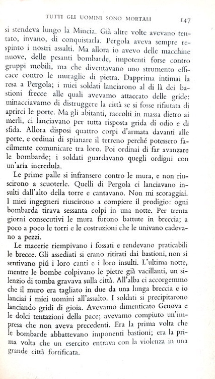 Cm. 19,5, pp. 427 (5). Brossura editoriale bicolore. Ordinaria patina del tempo alle estremità delle pagine. Esemplare nel complesso ben conservato. Simone de Beauvoir (Parigi 1908 - 1986) è stata una scrittrice, saggista, filosofa, insegnante e femminista francese, importante esponente dell'esistenzialismo. Questo romanzo (tit. orig.: Tous les hommes sont mortels, 1946) che racconta la storia di Raimon Fosca, un uomo condannato a vivere per sempre. La trama segue la sua vita attraverso i secoli, evidenziando la sua lotta con l'immortalità e la sua difficoltà a trovare un significato nella vita umana. Prima traduzione italiana a cura di Giancarlo Vigorelli. Collana Medusa, vol. 239. Cfr. Iccu.