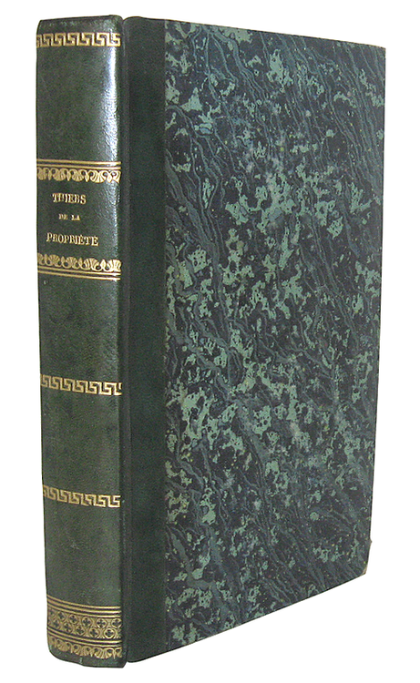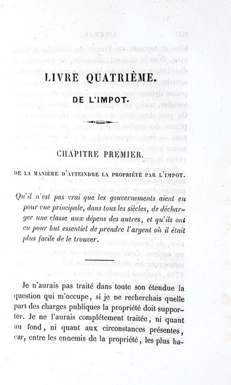 Cm. 21, pp. (4) 439 (1). Ottima legatura coeva in mezza pelle con titoli e filetti in oro al dorso. Lieve alone limitato alle prime carte e più marginalmente ad alcune centrali, peraltro esemplare fresco e ben conservato. Opera fondamentale dello storico ed economista francese che attraverso una critica sistematica delle teorie socialiste e comuniste applicate all'economia, fu grande propugnatore del diritto di proprietà. Parte significativa dell'opera è dedicata alla disciplina dell'imposta. Rara e ricercata prima edizione. Cfr. Iccu; Cat. Einaudi, 5585.