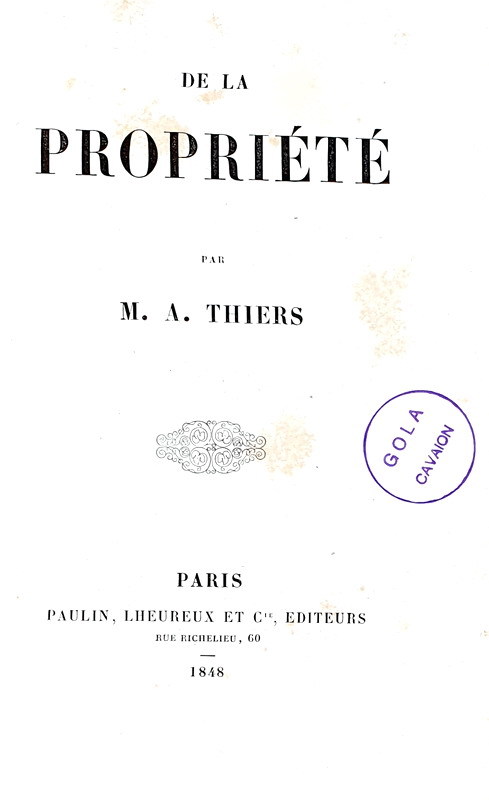 Adolphe Thiers - De la propriété - Paris 1848 (ricercata prima edizione)