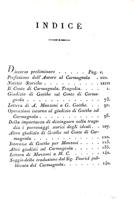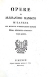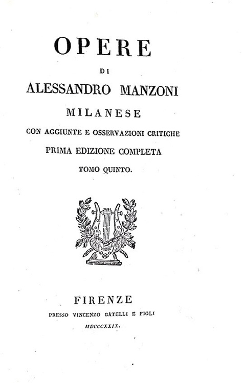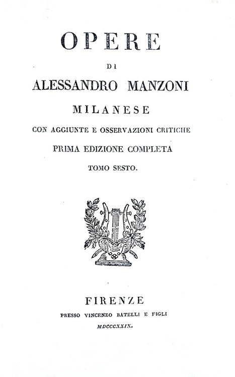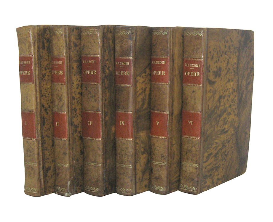 Sei volumi di cm. 19,5, pp. li (1), 345 (recte 245) (3); 312 (4); 381 (3); 287 (1); 296; 336. Con 6 illustrazioni fuori testo ad adornare “I promessi sposi”. Bella legatura coeva in mezza pelle marrone con i piatti rivestiti in carta marmorizzata. Dorso con fregi dorati e titoli in oro su doppio tassello in pelle rossa. Tassellino/ex-libris di biblioteca privata alle sguardie. Minima menda alla cuffia inferiore del secondo volume, strappetto all'angolo basso di p. 287 (quinto volume) con lesione di alcune lettere. Sporadiche e naturali fioriture/macchioline d'inchiostro. Esemplare completo in ogni sua parte e complessivamente ben conservato. La stamperia Batelli di Firenze fu la prima a progettare e pubblicare un'edizione di tutte le opere sino ad allora edite da Alessandro Manzoni. L'iniziativa non era stata autorizzata dall'Autore, e la cura dei testi fu affidata a Niccolò Tommaseo, che vi premise una ampia prefazione, interessante per conoscere i temi critici intorno a i quali si svolse il primo successo delle opere di Alessandro Manzoni. Dagli indici: Conte di Carmagnola (con varie lettere e saggi sull'opera), Adelchi (con numerosi articoli e saggi sull'opera), Poesie varie, Inni sacri, Sulla morale cattolica, I primessi sposi. Prima edizione completa delle opere di Manzoni, molto rara soprattutto da trovarsi completa dei sei volumi e di tutte le tavole. Cfr. Iccu.