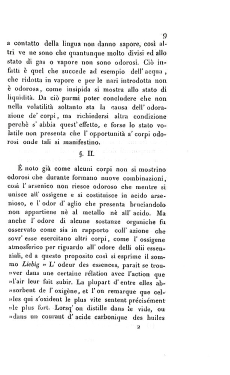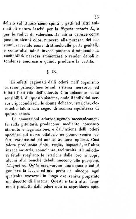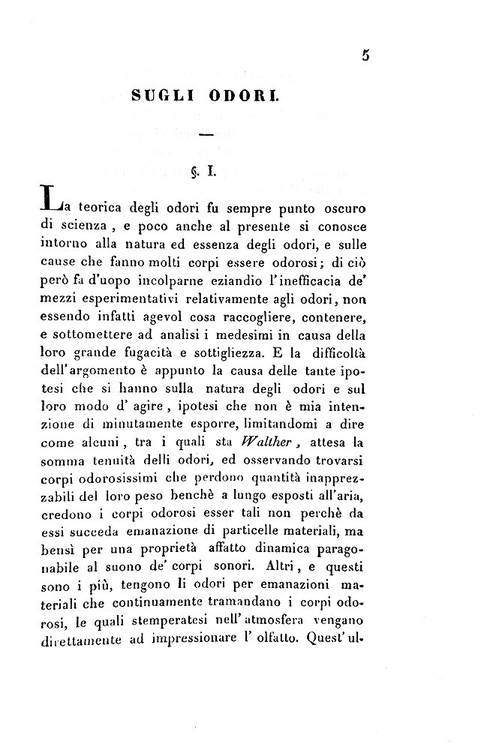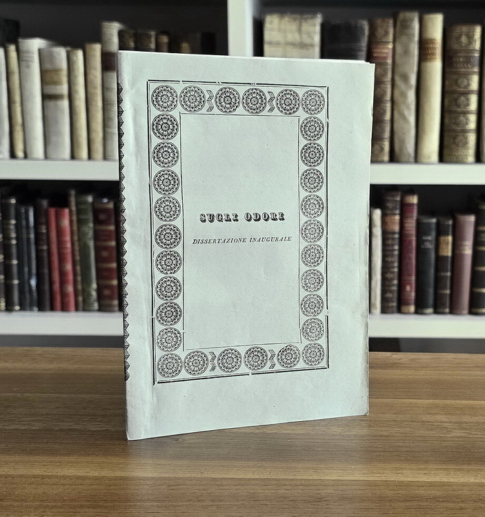 Cm. 22, pp. 39 (1). Brossura originale ornata. Esemplare fresco e ottimamente conservato. Introvabile prima e unica edizione di questo saggio medico-scientifico dedicato monograficamente al tema dell'olfatto e più in generale degli odori. Cfr. Iccu che menziona solo due esemplari conservati nelle biblioteche pubbliche italiane.