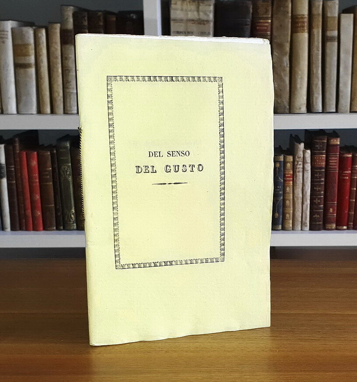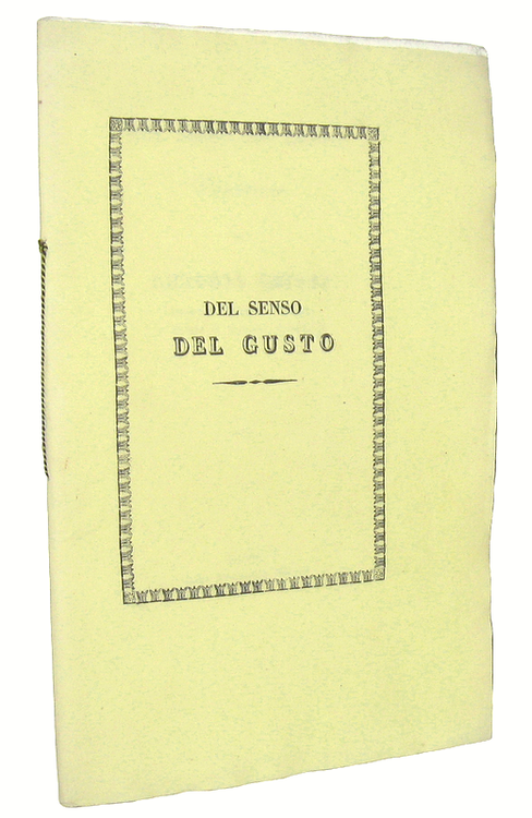Cm. 23,5, pp. 43 (1). Brossura editoriale ornata di colore giallino. Esemplare perfettamente conservato, a pieni margini. Interessante saggio dedicato al gusto e al funzionamento delle papille gustative che analizzano la saliva e identificano gli elementi che vi sono disciolti. Le informazioni raccolte vengono inviate al cervello sottoforma di stimoli. Rarissima prima e unica edizione, pressoché introvabile nel mercato antiquario. Cfr. Iccu che censisce solo due esemplari conservati nelle biblioteche italiane; non si ha notizia di altri esemplari anche conservati fuori dall'Italia.