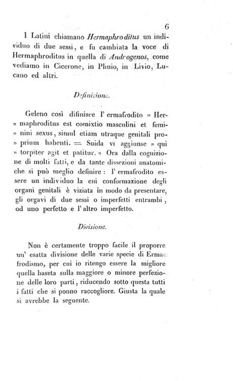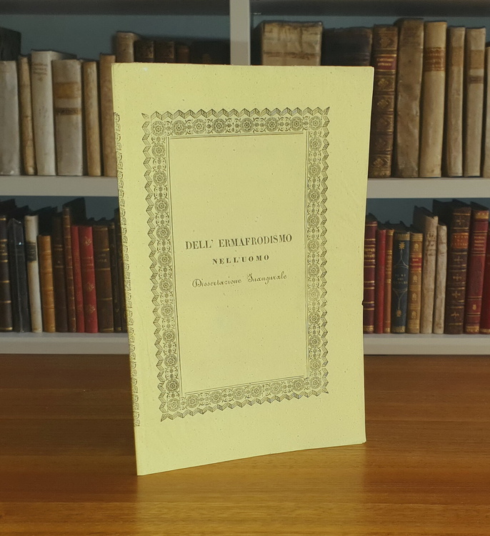 Cm. 22, pp. 19 (1). Brossura originale ornata. Esemplare perfettamente conservato. Introvabile prima e unica edizione di questo interessantissimo saggio medico-filosofico dedicato all'ermafroditismo umano e alle sue caratteristiche. Iccu non menziona alcuna copia conservata nelle biblioteche pubbliche italiane.