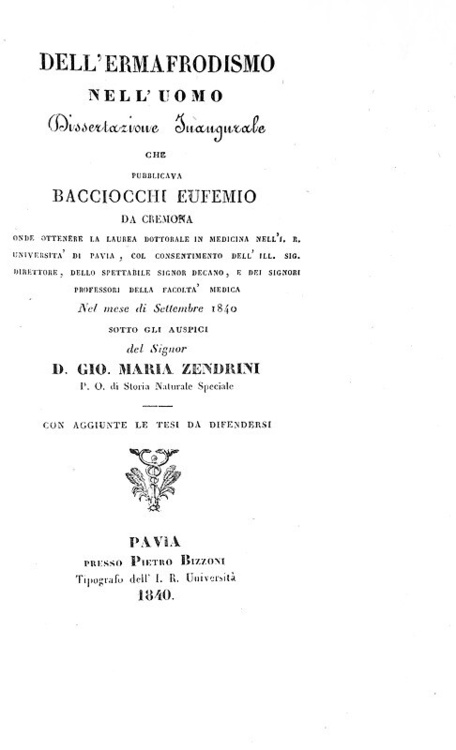 Dell'Ermafrodismo nell'uomo. Dissertazione inaugurale che pubblicava Bacciocchi Eufemio da Cremona onde ottenere la laurea dottorale in Medicina ... nel mese di Settembre 1840 sotto gli auspici del signor D. Gio. Maria Zendrini P.O. di Storia Naturale Speciale. Con aggiunte le tesi da difendersi. Pavia, presso Pietro Bizzoni, tipografo dell'I.R. Università, 1840.
