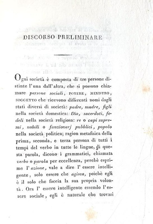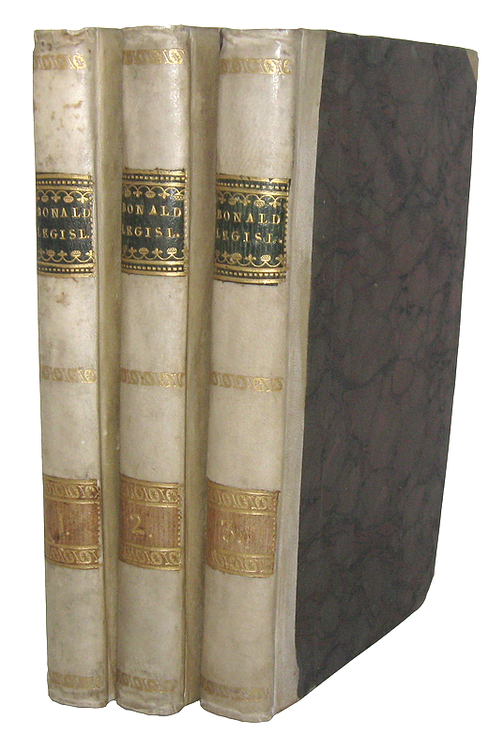 Tre volumi di cm. 21, pp. viii, 222 + 1 c.b.; (4) 259 (1); (8) 275 (1). Ottima legatura coeva in mezza pergamena con punte; titoli su doppio tassello e filetti ornati in oro al dorso. Lievi e naturali fioriture sparse, peraltro esemplare ben conservato. Louis Gabriel Ambroise visconte di Bonald (1754-1840), pensatore politico francese, fu tra i principali intellettuali del tempo. Membro dell'Assemblea dal 1790 si dimise per convinzioni religiose e ripiegò in Germania. Rientrato in Francia nel 1797 ebbe modo di maturare simpatie per la politica napoleonica salvo contestarne dopo qualche anno la politica ecclesiastica. Bonald avversò la teoria del contratto sociale sostenenedo con vigore la necessità naturale della monarchia ereditaria di tipo francese. Quest'importante trattato sulla legislazione indaga sopra l'origine storica, secondo una lettura filosofico-giuridica, dei principali istituti di diritto pubblico, criminale, civile ed internazionale. Verosimilmente prima edizione italiana. Raro. Cfr. Iccu.