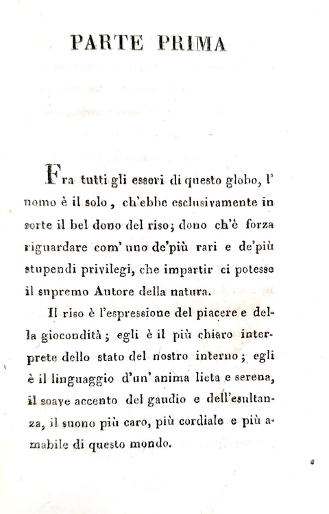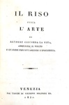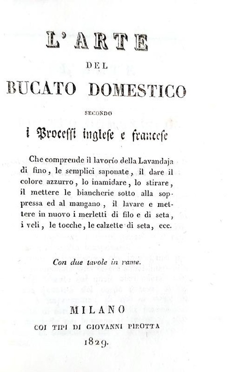 Pp. 72. Preceduto da: Il riso ossia l'arte di rendere gioconda la vita, abbellire il volto e guarire perfettamente l'ipocondria. Venezia, dai torchi di Giuseppe Molinari Ed., 1831. Pp. 80. Unito a: L'arte del bucato domestico secondo i processi inglese e francese. Che comprende il lavorio della lavandaja di fino, le semplici saponate, il dare il colore azzurro, lo inamidare, lo storare, il mettere le biancherie sotto alla soppressa ed al mangano, il lavare e mettere in nuovo i merletti di filo e di seta, i veli, le tocche, le calzette di seta, ecc. Milano, coi tipi di Giovanni Pirotta, 1829. Pp. 108 (due tavole ripiegate f.t. con 21 figure incise in rame; piccolo restauro nella parte bianca della prima tavola). Unito a: PASTA ANDREA. Galateo dei medici. In Milano, nella Stamperia di Giacomo Barelle, s.a. (ma fine XVIII secolo, così Opac-Sbn: "Presumibilmente pubblicato intorno all'ultima decade del sec. 18., periodo di attività dello stampatore"). Pp. 35 (1). Quattro opere in un volume di cm. 13,5. Legatura del tempo in mezza pelle con titoli su tass. e filetti ornati in oro al dorso; tagli spruzzati. Lievi fioriture limitate all'ultimo saggio settecentesco. Bell'esemplare. Interessantissima miscellanea di quattro rari saggi pubblicati tra la fine del Settecento e i primi decenni dell'Ottocento. Nel saggio di Bornholz si tratta la maniera d'ottenere con piantate artificiali de' tartufi neri e bianchi, nelle selve, ne' boschetti e ne' giardini. Rarissima prima edizione italiana (ediz. orig. 1825). Cfr. Niccoli, 225. Cfr. Iccu.