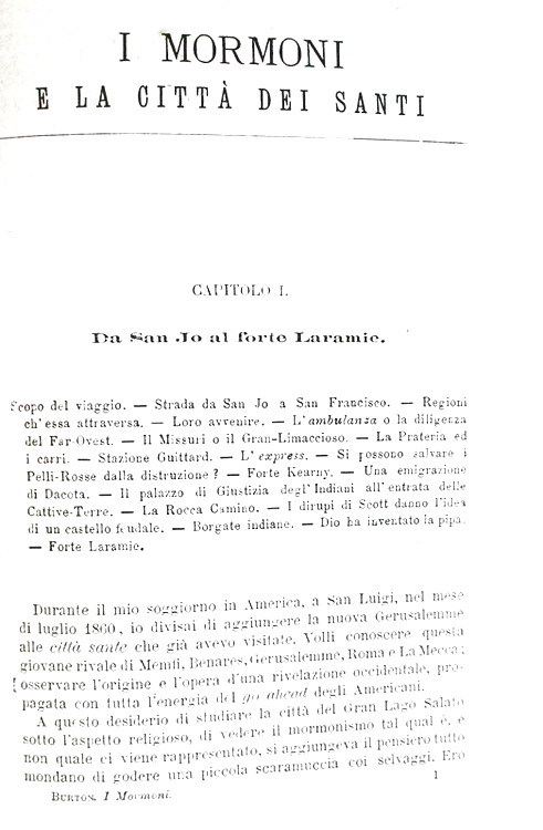 I mormoni e la città dei santi. Viaggio del capitano Riccardo Burton. Con una carta e 31 incisioni. Milano, Fratelli Treves editori, 1875.