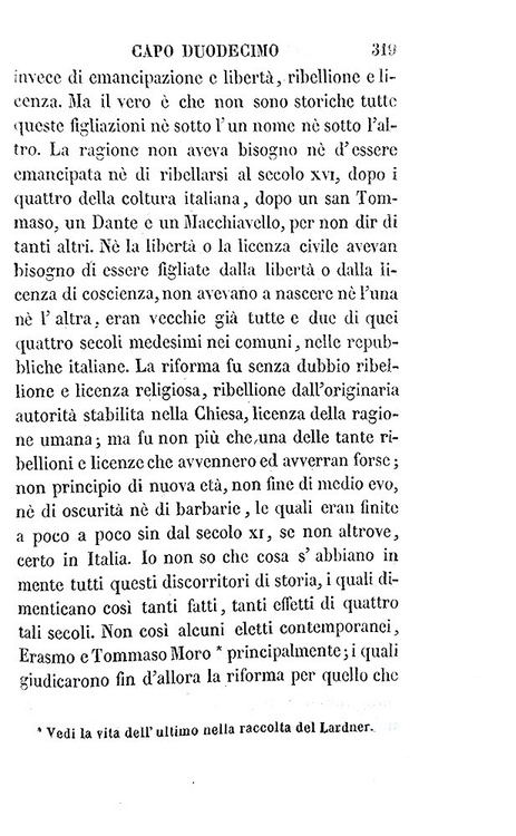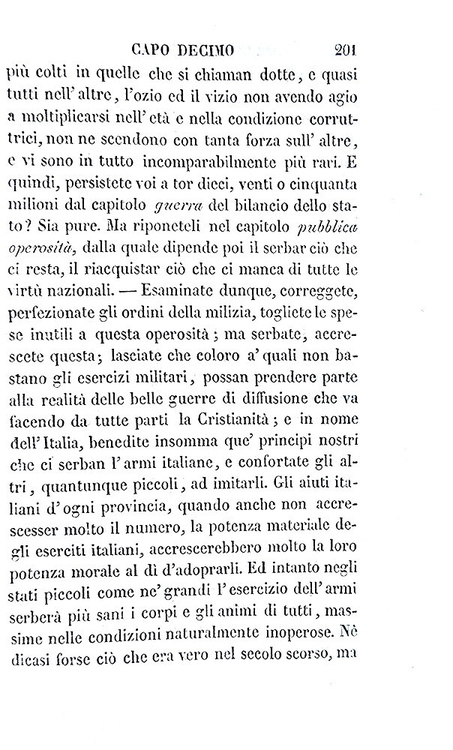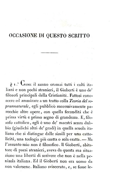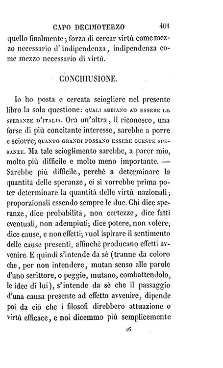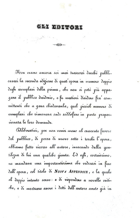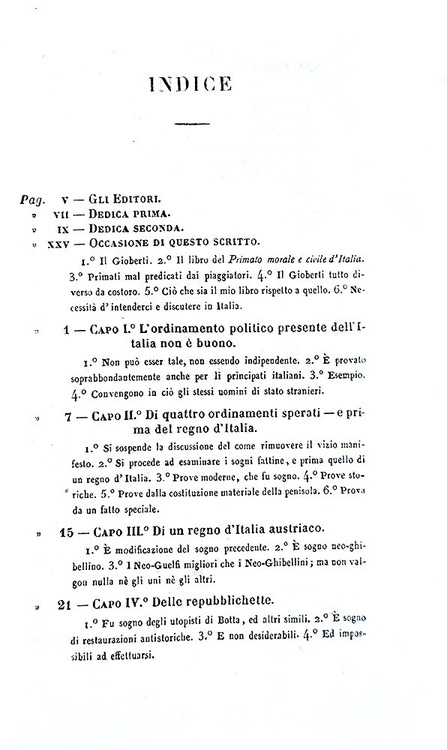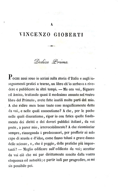 Cm. 17,5, xxxi (1), 498 + (6) di catalogo editoriale. Bella legatura strettamente coeva in mezza pelle marrone con titoli, filetti e ricchi fregi dorati al dorso; piatti in carta marmorizzata. Minime tracce d'uso alla legatura e ordinari segni del tempo, lievi fioriture sparse. Esemplare nel complesso genuino e ben conservato. Cesare Balbo (1789-1853), scrittore e uomo politico torinese, fu patriota e personaggio centrale del Risorgimento italiano. Delle Speranze d'Italia è un saggio uscito all'indomani della pubblicazione da parte di Vincenzo Gioberti (1801-1852), del Primato morale e civile degli Italiani. In esso Balbo prende in esame il programma neoguelfo che era stato esposto da Gioberti, valutandone le implicazioni politiche e militari. Il libro è dedicato allo stesso Gioberti, a cui Balbo si rivolge come «Signore ed Amico», stimandolo e riconoscendolo come uno dei filosofi più autorevoli della Cristianità: «Questo libro ebbe occasione ed origine da voi; e mi venne incominciato con impeto, appena io m'ebbi in quattro o cinque dì, studiato, annotato e come si suol dire divorato il libro vostro; e incominciai riconoscendo ed avvertendo tale origine. Ma finito ora, e sperando non aver offeso nel dissentire voi che stimo, venero ed amo in vostra persona, ed aver espressa la mia ammirazione per tante parti de' vostri scritti, ho pensato dedicarvi questo, come protesta di tali mie intenzioni e speranze» (Cesare Balbo, dalla Dedica del novembre 1843). La prima edizione dell'opera fu stampata a Parigi perché, essendo lo scopo dichiarato del libro il perseguimento dell'indipendenza italiana, risultò pressoché impossibile, stamparlo in Italia, dove era forte il peso della censura austriaca e il rischio di esilio. L'opera circolava segretamente negli Stati italiani come testo di formazione patriottica. Dall'indice: Capo I. L'ordinamento politico presente dell'Italia non è buono; Capo II. Di quattro ordinamenti sperati - e prima del regno d'Italia; Capo III. Di un regno d'Italia austriaco; Capo IV. Delle repubblichette; Capo V. Della considerazione degli Stati presenti; Capo VI. La confederazione è impossibile finché una gran parte d'Italia è provincia straniera; Capo VII. Breve storia dell'impresa d'indipendenza, proseguita sempre, non compiuta mai per XIII secoli; Capo VIII. Eventualità future dell'impresa; Capo IX. L'eventualità più promettitrice; Capo X. Come si possano aiutare i principi italiani; Capo XI. Come si possano aiutar tutti gli italiani; Capo XII. Breve storia del progresso cristiano; Capo XIII. Il progresso cristiano presente, ed accrescimento che ne viene a tutte le speranze italiane; Appendice. Se e come sia sperabile una lega doganale in Italia; Nuova appendice. A molte critiche una risposta: fatti nuovi. Cfr. Iccu e per le vicende bibliografiche delle Speranze d'Italia Caddeo, pp. 42-46.
