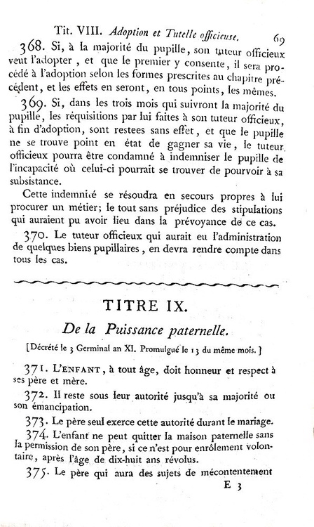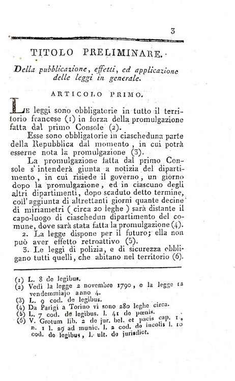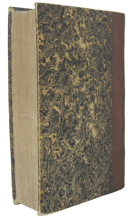 Pp. (4) 436. Bella vignetta xilografica al frontespizio e due graziose incisioni nelle carte finali. Unito a: Supplément aux éditions parues jusq'au 1.et septembre 1807 du Code civil des français au quel on a donné le titre de Code Napoleon, contenant les changemens, additions et suppressions faites au dit code dans la dernière sèance du corps législatif. Turin, chez Dominique Orgeas, libraire, rue Doire-grosse vis-à-vis l'Englise de la Trinité n. 12., 1807. Pp. 31 [ma 41] (3). Unito a: Raccolta delle leggi componenti il codice civile con annotazioni. Volume primo. Torino, dalla Stamperia Filantropica, anno XI (1802-1803). Pp. (8) 244. Tre distinte opere in un volume di cm. 19. Bella legatura strettamente coeva in mezza pelle con titoli e filetti in oro e bei fregi impressi a secco al dorso. Carta marmorizzata ai piatti. Trascurabili segni del tempo alla legatura, qualche sporadica macchietta e lievi fioriture sparse (più marcate nelle carte inziali e finali). Esemplare nel complesso genuino e ben conservato. Rara e ricercata prima edizione nella tiratura in ottavo del più importante codice della storia giuridica moderna [esiste anche una tiratura in quarto con gli stessi dati tipografici ma con diversa paginazione], basilare per tutta la tradizione civilistica continentale. Impreziosisce questo esemplare del codice napoleonico il raro “Supplemento alle edizioni che furono pubblicate sino al 1° settembre 1807 del Codice civile de' Francesi” [Supplément aux éditions …]. Segue altresì il primo volume della raccolta di leggi che sarebbero poi confluite nel codice civile (opera con 2 frontespizi con parità di elementi su pagine opposte; a sinistra si trova quello nella lingua originale). Cfr. Iccu.