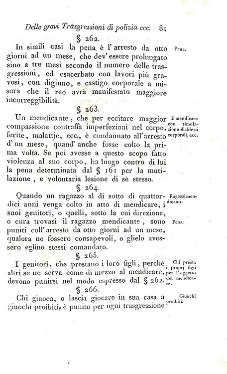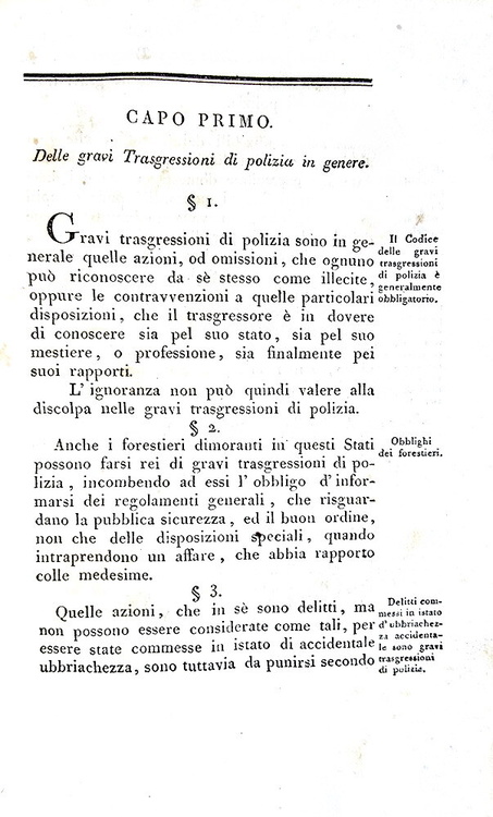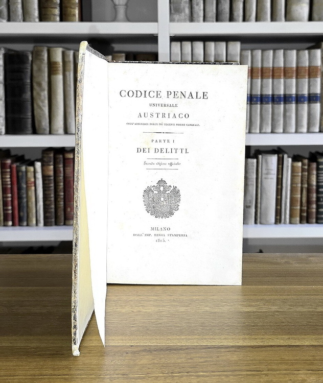 Due parti in un volume di cm. 24, pp. xv (1) 270 (4); (2) 201 (1) + (2) d'errata. Graziosa legatura strettamente coeva in mezza pelle con titoli e filetti in oro al dorso liscio. Piatti in carta marmorizzata e tagli spruzzati. Lievi tracce d'uso alla legatura. Fioriture sparse, più diffuse nella parte centrale del libro. Esemplare nel complesso genuino e in buono stato di conservazione. Il Codice Penale Universale Austriaco promulgato nel 1803 da Francesco II unificava il diritto penale nelle terre di dominazione austriaca e, successivamente, anche nel Regno Lombardo-Veneto. L'edizione milanese del 1815, fondamentale per l'applicazione nel contesto lombardo, separava i reati in gravi e meno gravi, con un approccio basato sulla severità e sulla certezza della pena. La prima parte tratta dei delitti, ovvero delle azioni che costituiscono reato e che sono punite dalla legge. La seconda parte, invece, si occupa delle gravi trasgressioni di polizia, ovvero delle violazioni delle norme di ordine pubblico e di sicurezza. Non comune e sempre ricercato. Cfr. Iccu.