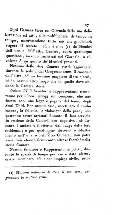 Cm. 21,5, pp. 44. Presente la rara brossura editoriale con mancanze restaurate professionalmente (entrambi i piatti sono stati controfondati internamente con carta giapponese e con carta antica utilizzata nei margini per restituire piena integrità e usabilità alla brossura). Buchetto circolare di pochi mm. al frontespizio. Qualche trascurabile e sporadica fioritura. Esemplare nel complesso in buono stato di conservazione, internamente fresco. La Costituzione degli Stati Uniti d'America è la legge fondamentale degli Stati Uniti d'America. Il testo, che originariamente comprendeva solo sette Articoli, delinea la struttura di governo del paese. I suoi primi tre Articoli incarnano il concetto democratico basilare della separazione dei poteri, per cui il governo federale è diviso in tre rami: il potere legislativo, costituito dal Congresso degli Stati Uniti (Articolo I); il potere esecutivo, composto dal Presidente degli Stati Uniti d'America e dal suo gabinetto di governo (Articolo II); e il potere giudiziario, composto dalla Corte suprema degli Stati Uniti d'America e dagli altri tribunali federali (Articolo III). L'Articolo IV, l'Articolo V e l'Articolo VI incarnano i concetti del federalismo, descrivendo i diritti e le responsabilità degli organi legislativi dei singoli Stati federati degli Stati Uniti d'America, e della loro relazione col governo federale e il processo condiviso di emendamento costituzionale. L'Articolo VII stabilisce la procedura successivamente utilizzata dalle originali Tredici colonie per la ratifica. All'interno della Costituzione è custodita la clausola di supremazia, che attribuisce alla legge federale la priorità rispetto alle leggi degli Stati federati. La Costituzione venne stilata tra il maggio e il settembre 1787 dalla convenzione di Filadelfia e ratificata nel giugno 1788. Entrò in vigore nel marzo 1789. Dalla nota dell'editore: "La libertà americana, consolidata con la guerra che i popoli dei 13 Stati ebbero a sostenere contro l'Inghilterra, parve vicina a fuggir loro di mano, allorché fu conclusa la pace. Ognuno degli Stati, stanco della sua lunga agitazione, dei suoi lunghi sacrifici non si occupava più che di riguardare per sè solo tutto quello che gli altri avevano perduto per lui. Ma tutte le persone di sano giudizio, furono convinte di questa verità che la libertà di un popolo non dura sinché è abbastanza forte per difenderla. Una convenzione generale fu formata a Filadelfia nel mese di maggio 1787. Era composta da tutti gli Stati, eccettuato quello di Rhode Island, e Washington n'era presidente: essa adottò una costituzione unica, che fu sucessivamente presentata all'approvazione d'un congresso dei tredici Stati". Edizione molto rara e ricercata, una delle prime traduzioni (verosimilmente la seconda) in lingua italiana della Costituzione americana. Ne esiste una precedente stampata nel 1797 (con luogo di stampa Filadelfia). Cfr. Iccu.
