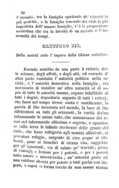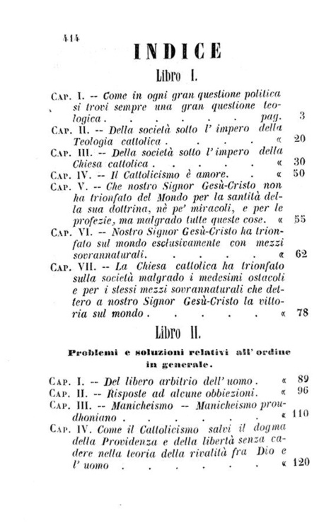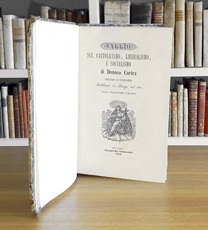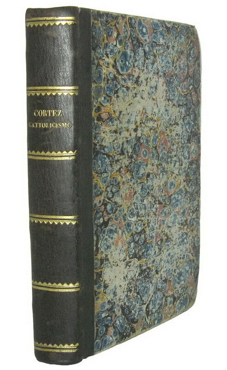 Cm. 20,5, pp. (2) 416. Bella legatura strettamente coeva in mezza pelle con titoli e filetti in oro al dorso. Tagli spruzzati. Trascurabili e sporadiche fioriture. Esemplare nel complesso fresco e ben conservato. Juan Valdegamas Donoso Cortez (1809-1853), letterato e deputato spagnolo di area liberale, dopo il 1848 abbandonò il liberalismo per abbracciare la dottrina del cattolicesimo tradizionale. In questo celebre saggio trova definitiva sistemazione a livello teorico l'abiura delle idee liberali. L'opera costituisce uno dei testi base della letteratura reazionaria, sulla linea di De Maistre e Bonald, rifiutando da un lato le idee liberali e dall'altra il nascente socialismo, che era venuto emergendo prima e durante il '48 europeo, in nome del principio di autorità e dell'ortodossia cattolica. In appendice sono contenuti alcuni celebri discorsi tra cui quello tenuto alle Cortes sulle condizioni dell'Europa (1850). Non comune prima edizione italiana (contemporanea a quella napoletana curata della Società de' Compilatori della Biblioteca Cattolica). L'edizione originale dell'opera apparve nel 1851 a Madrid con il titolo Ensayo sobre el Catolicismo, el Liberalismo, y el Socialismo. Cfr. Iccu; Daniele in Enciclopedia Cattolica, IV, pp. 1879-1880).