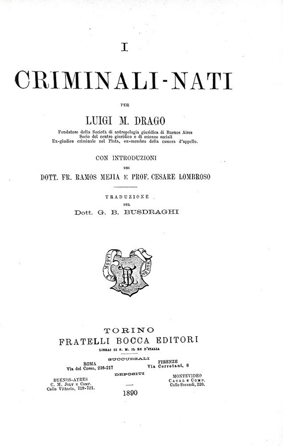 I criminali - nati. Con introduzioni dei dott. Fr. Ramos Mejia e prof. Cesare Lombroso; traduzione del dott. G. B. Busdraghi. Torino, Fratelli Bocca editori, 1890.