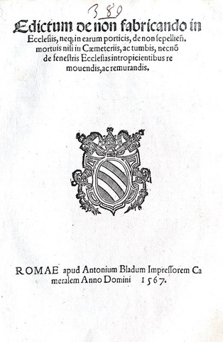 Copia motus proprii concessionis officii camerariatus bo. me. illustrissimo cardinali Vitellio factae per Pium quartum, (10 Nov. 1564). [Seguono:] Copia collationis factae de officio camerariatus bo. me. cardinali Vitellio à Pio IV in consistorio. Copia regulae cancellariae sanctissimi domini nostri Pii Papae Quinti (19 Gen. 1566). Copia bullae consistorialis super concessione officij camerariatus factae a Pio Quarto, cardinali Vitellio ... (15 Dic. 1564). Copia confirmationis officii camerariatus per sanctissimum D.N. Pium Quintum. (24 Gen. 1566). S.n.t. (Roma, Blado, 1566?) SCHEDA COMPLETA