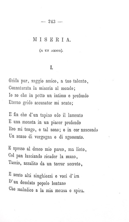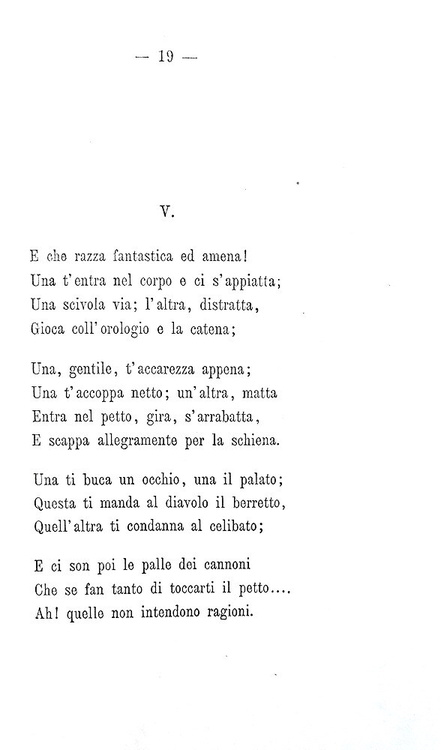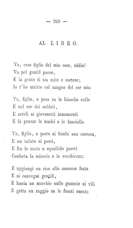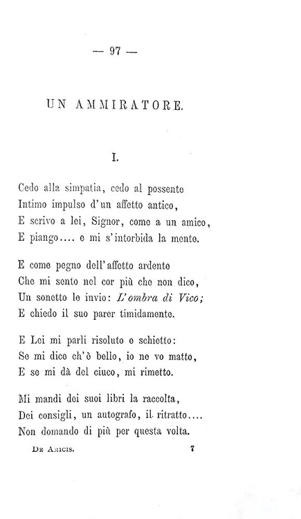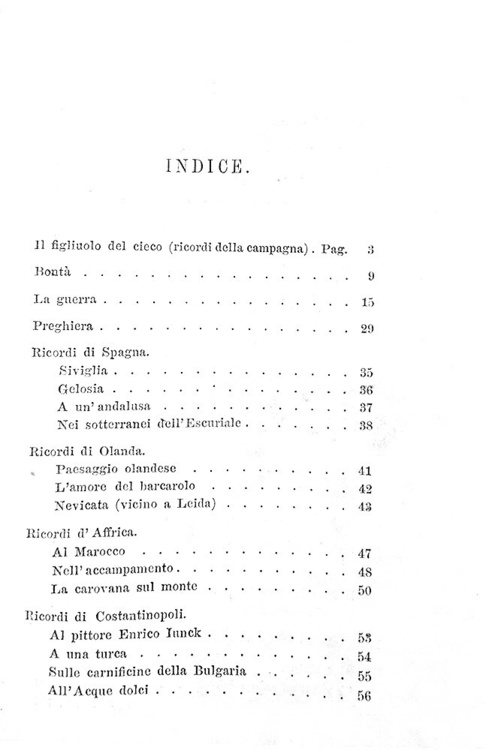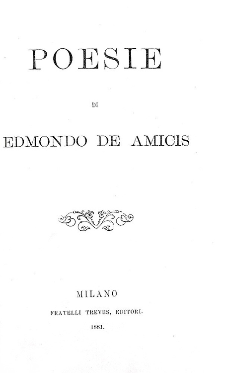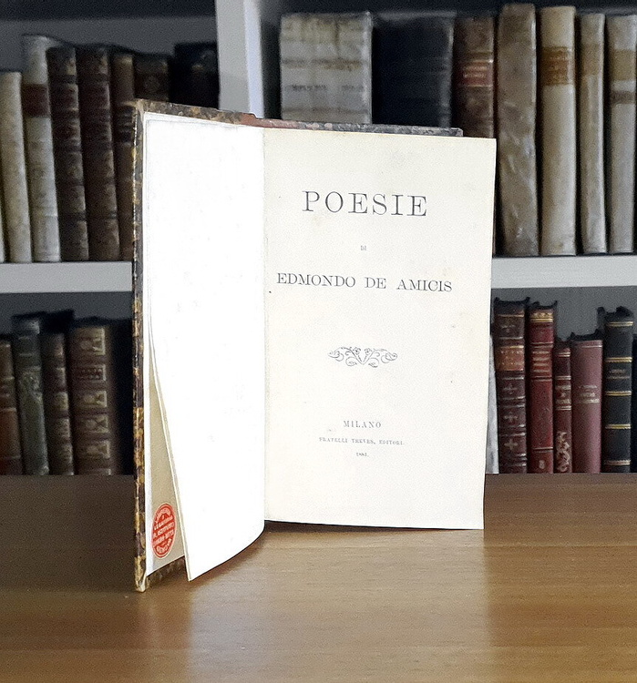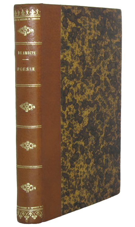 Cm. 15,5, pp. (4) 275 (1). Bella legatura del tempo (Legatoria R. Istituto Sordo-muti di Genova) in mezza pelle con titoli e fregi in oro al dorso e bella carta marmorizzata ai piatti. Lievi e naturali fioriture sparse (più evidenti alle prime e ultime carte). Esemplare nel complesso ben conservato. Non comune e ricercata prima edizione delle poesie di Edmondo De Amicis (1846-1908), considerate enigmatiche, ancorché secondarie, nell'ambito della sua produzione letteraria, culminata con la pubblicazione di Cuore che avvenne pochi anni dopo.Cfr. Iccu; Parenti, Prime edizioni italiane, p.192; Parenti, Rarità bibliografiche, VII, pp.294-296; Biancardi-Francese, Prime edizioni italiane, p. 157.