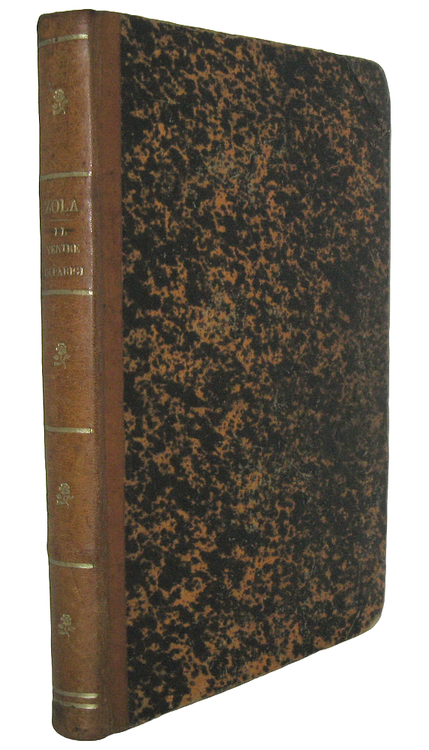 Cm. 27,5, pp. (2). 408. Con numerosissime belle illustrazioni xilografiche perlopiù a piena pagina di autori vari (Kemplen, Castelli, Perrighon, Tauxier, ecc.). Ben preservato il piatto anteriore della bella brossura illustrata, fascicolato prima del frontespizio. Legatura strettamente coeva in mezza pelle con titoli, fregi e filetti in oro al dorso. Minimi segni del tempo alla legatura. Leggere arrossature/fioriture, perlopiù marginali e qualche macchietta sparsa. Esemplare genuino e complessivamente in buono stato di conservazione. Ricercata prima edizione italiana di questo celebre affresco zoliano delle Halles di Parigi e della pittoresca vita che brulicava attorno ad esse, fra i romanzi più rappresentativi del Naturalismo francese. L'edizione originale francese del libro, costituente il terzo volume del ciclo dei Rougon-Macquart, fu pubblicata a Parigi nel nel 1873. "Zola descrive la democrazia corrotta di Parigi senza pietà, senza velo, nella sua cruda e oscena nudità. Se ti senti male, e se ti vengono i brividi, questo è voluto da lui", scrisse Francesco De Sanctis a proposito del romanzo nel memorabile saggio critico che ad esso dedicò. Cfr. Iccu.