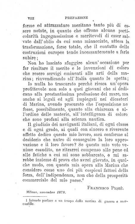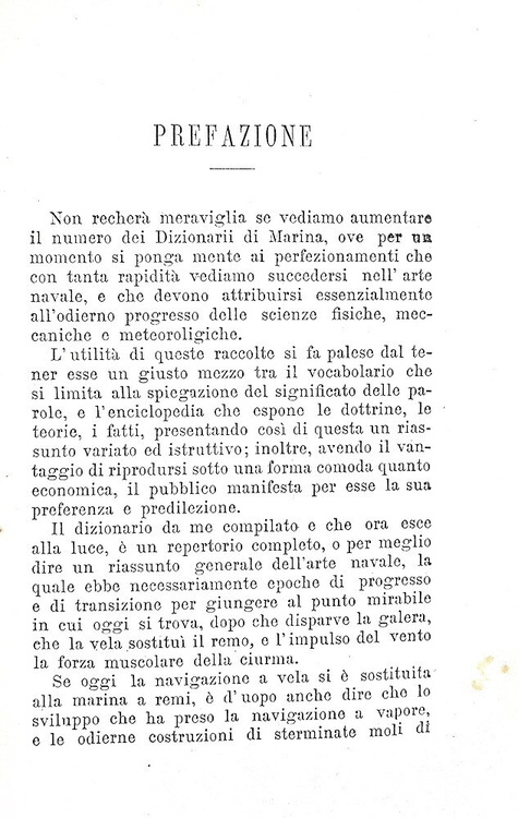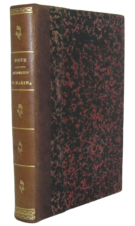 Cm. 21, pp. viii, 442 + (2) di errata [le pp. 393-442 contengono l'Appendice al dizionario di marina pubblicata con autonomo occhietto]. Testo su due colonne. Ottima legatura strettamente coeva in mezza pelle con titoli, fregi e filetti in oro al dorso. Tagli spruzzati. Minimi segni del tempo e qualche sporadica/trascurabile fioritura. Esemplare nel complesso fresco e ben conservato. Interessantissimo repertorio dei termini propri dell'arte navale così definito dallo stesso Autore: «un giusto mezzo tra il vocabolario che si limita alla spiegazione del significato delle parole, e l'enciclopedia che espone le dottrine, le teorie, i fatti, presentando così di questa [ndr la marina] un riassunto variato e istruttivo; inoltre, avendo il vantaggio di riprodursi sotto una forma comoda quanto economica, il pubblico manifesta per esse la sua preferenza e predilezione». Lo scrittore livornese Francesco Piquè scrisse numerose opere, tra le quali merita menzione particolare il rarissimo e ricercato “Gran dizionario infernale”pubblicato nel 1870 a Milano dall'editore Enrico Politti. Rara seconda edizione dopo la prima del 1878 uscita dai medesimi torchi. Cfr. Iccu che però non fa menzione dell'errata finale presente nel nostro esemplare.