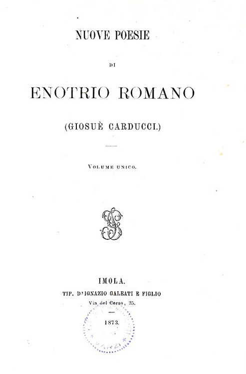 Nuove poesie di Enotrio Romano (Giosuč Carducci). Volume unico. Imola, Tip. d'Ignazio Galeati e figlio, 1873.