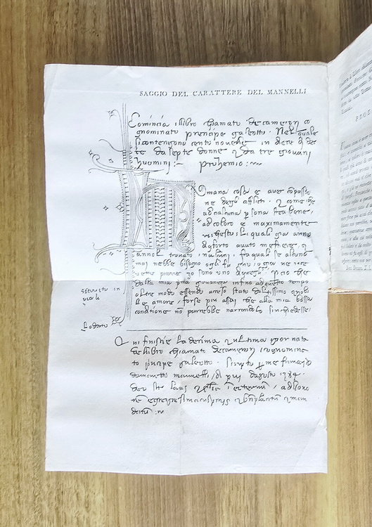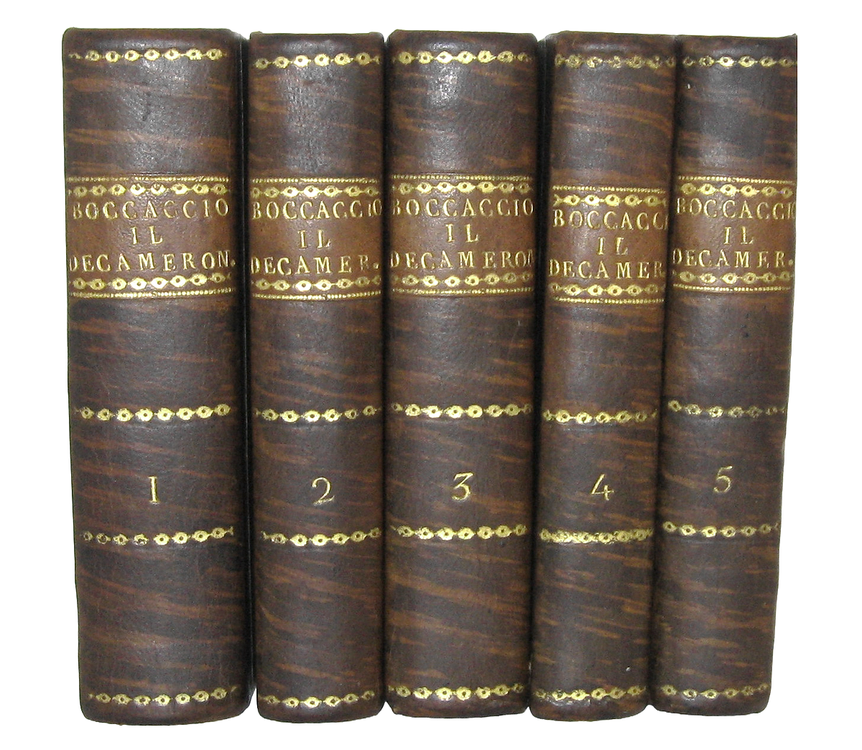 Cinque volumi di cm. 12,5, pp. xxviii, xliv, 320; xii, 292; xx, 314; viii, 246; viii, 260. Con un bel ritratto dell'Autore inciso in acciaio all'antiporta e tre belle tavole f. t. incise in rame e più volte ripiegate (veduta di Villa Schifanoia, veduta della Valle delle donne, fac-simile dell'autografo del Mannelli che curò questa pregevole edizione già nel 1761). Bella legatura del tempo in mezza pelle con punte; dorso liscio con titoli su tassello, filetti e numero progressivo del volume in oro. Tagli rossi. Fisiologici segni del tempo, peraltro esemplare nel complesso fresco e ottimamente conservato. Deliziosa e ricercata edizione di piccolo formato del capolavoro boccaccesco. Bacchi della Lega, Serie delle edizioni delle opere di Giovanni Boccaccio, p.55: "pregiata edizione, a cui, oltre alla vita del Boccaccio , scritta da Girolamo Tiraboschi, vanno unite le Osservazioni istoriche e critiche del Martinelli". Gamba (Serie di testi di lingua, 187) invece scrive: "ristampa degna di stima nella quale l'editore diligente si attenne al testo ma senza raddoppiare le consonanti". In fine alle pp. 175-256 troviamo le “Varie lezioni del Decameron tratte dall'edizione pubblicata in Firenze per gli Eredi di Filippo Giunta nel 1527”. Cfr. anche Iccu.