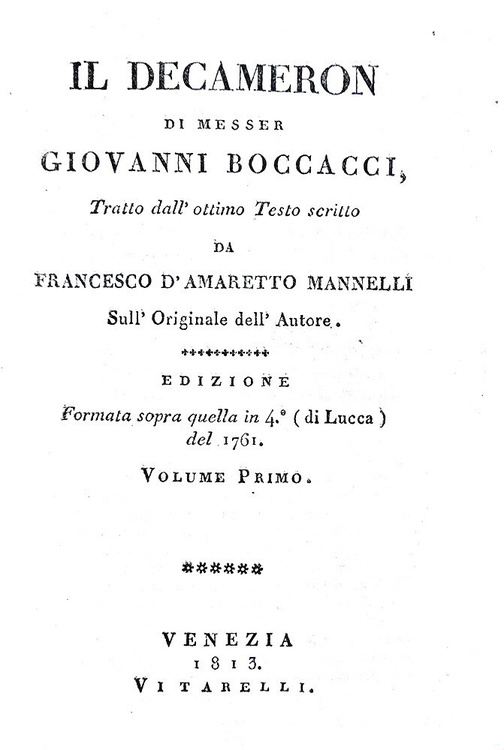 Il Decameron tratto dall'ottimo testo scritto da Francesco D'Amaretto Mannelli sull'originale dell'autore. Venezia, Vitarelli, 1813.