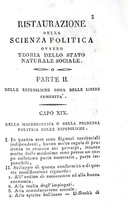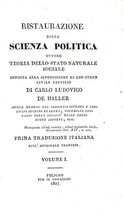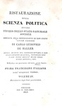 Ristaurazione della scienza politica ovvero teoria dello stato naturale sociale opposta alla supposizione di uno stato civile fattizio. Foligno, per il Tomassini, 1827-30.