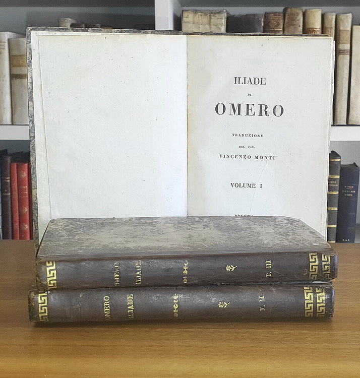 Tre volumi di cm. 20,5, pp. (8) 274 (4); 299 (3); 270. Legatura strettamente coeva in mezza pelle con titoli e filetti in oro al dorso. Minime tracce d'uso alla legatura con carta marmorizzata ai piatti leggermente lisa, trascurabili e sporadiche macchiette/fioriture. Esemplare nel complesso ben conservato. Questa importante edizione dell'Iliade di Omero nella traduzione italiana di Vincenzo Monti, fu uno dei libri di maggiore successo dell'Autore e più in generale di tutta letteratura italiana del primo Ottocento. Ancora oggi resta fondamentale per la conoscenza in Italia del testo omerico. Il successo fu immediato nonostante le critiche giunte da vari letterati del tempo, primo tra tutti il Foscolo che irrise il Monti con un epigramma in cui lo definiva "gran traduttor dei traduttor d'Omero"; Monti infatti aveva una conoscenza del tutto superficiale della lingua greca, ed elaborò la sua libera traduzione poetica del poema omerico servendosi delle traduzioni di altri autori. Rara e ricercata prima edizione. Cfr. Iccu; Parenti, Prime edizioni italiane, p. 355; Biancardi-Francese, Prime edizioni italiane, p. 316; Bustico, 354.