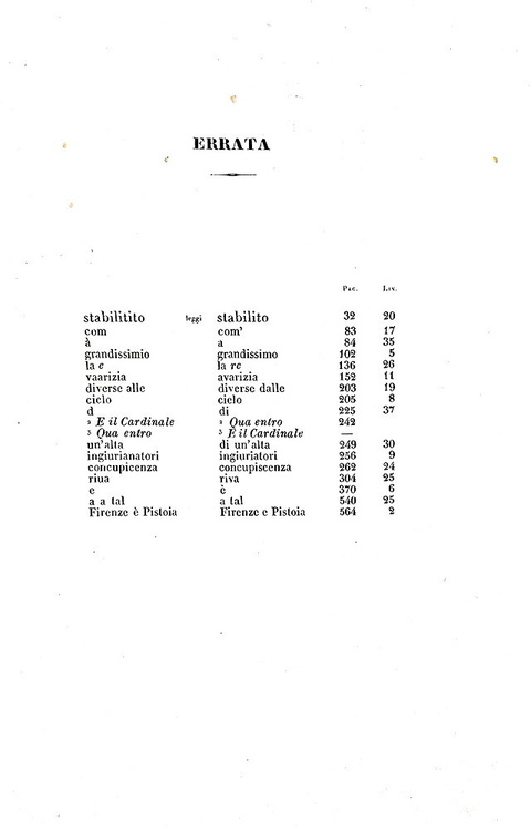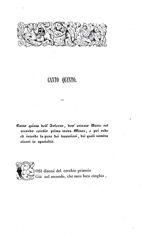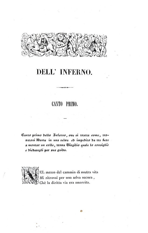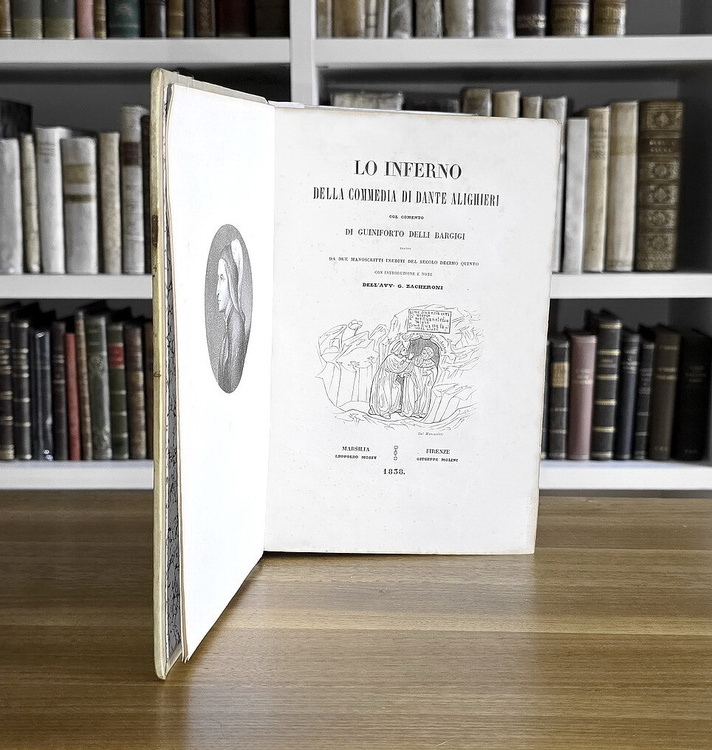 Cm. 24,5, pp. (6) xxiv (10), 766 + 1 c. di errata. Dante e Virgilio davanti alla porta dell'Inferno raffigurati al frontespizio e 12 belle tavole f.t. incise in rame (alcuni ritratti e le altre tavole perlopiù inerenti Dante e Virgilio). Bellissimi capilettera litografici; testatine e finalini ornati posti all'incipit e a conclusione di ogni canto. Bella legatura inglese del tempo (firmata “bound by H. Stone Banbury”, con tassellino applicato al contropiatto anteriore) in piena pergamena rigida con titoli su tassello e ricchissimi fregi in oro. Piatti inquadrati da duplice filetto dorato, carta marmorizzata ai contropiatti e tagli rossi. Sporadiche fioriture/arrossature, peraltro esemplare ben conservato. Importante edizione del commento all'Inferno del pavese Guiniforte Barzizza (1406-1463) che ne avviò la stesura intorno al 1440 su incarico del duca di Milano Filippo Maria Visconti. Non risultano purtroppo tramandati e pervenuti i commenti al Purgatorio e al Paradiso. Il testo del Barzizza è oggi tramandato da due codici oggi in possesso della Biblioteca Nazionale di Parigi (ms. Ital. 1469 e ms. Ital. 2017) ma al tempo dell'edizione a stampa curata dall'avvocato imolese Giuseppe Zaccheroni (1800-1876), mazziniano esule in Francia, il codice Ital. 2017 (appartenuto ai Visconti Sforza) non faceva però ancora parte della biblioteca parigina. Il 9 Settembre del 1840 la Congregazione del Sant'Uffizio emanò un decreto di condanna di questa edizione (che venne stampata in un numero assai ridotto di esemplari, come riporta Mambelli), a causa delle tesi aspramente anticlericali espresse da Zacheroni nell'introduzione. Rarissima prima edizione [si segnala un'altra tiratura priva della “Introduzione alla gioventù italiana”, qui presente alle pp. i-xxiv, e con un minore numero di tavole]. Cfr. Mambelli, 205: “fatta a pochissime copie”; Iccu.