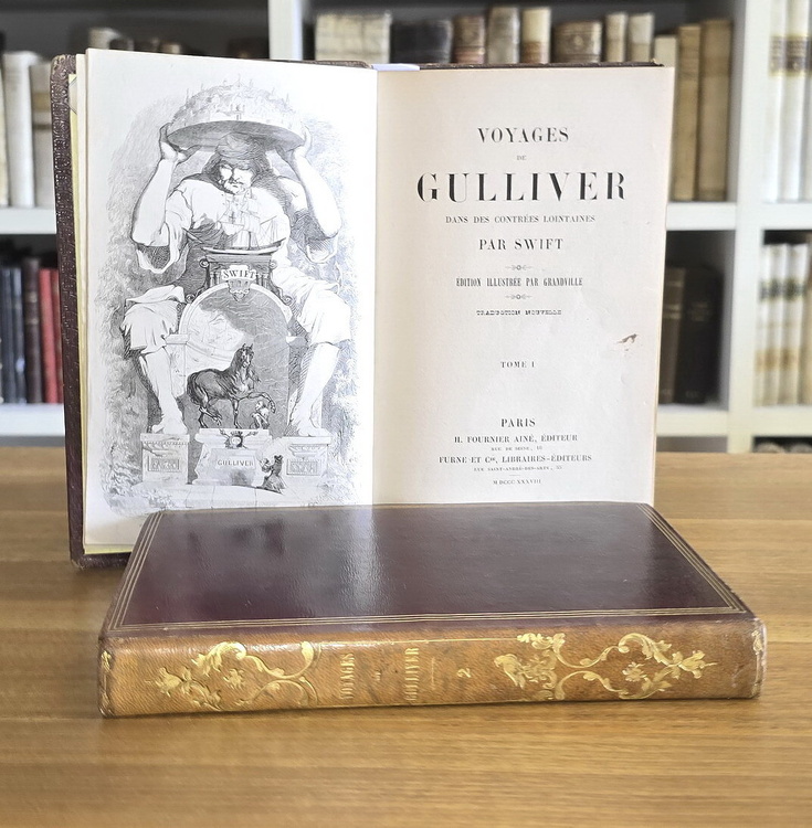 Due volumi di cm. 20, pp. (4) lxix, 277 (1); (4) 319 (1). Antiporta illustrata su carta di Cina al primo volume, 4 occhietti illustrati (uno per ciascun viaggio) e 450 belle vignette xilografiche nel testo. Bella legatura del tempo in piena pelle con titoli e ricchi fregi in oro al dorso. Piatti inquadrati da triplice filetto dorato, dentelles e tagli in oro, segnacolo in seta blu. La legatura in stile romantico fu realizzata dalla legatoria parigina Schaeck, che operò come "Engel et Schaeck" dal 1838 al 1851 con Jean Engel (1811-1892) come socio. Segni del tempo e minime mende alla legatura. Lievi e sporadiche fioriture/macchiette. Esemplare nel complesso genuino e ben conservato. Capolavoro della letteratura inglese di Jonathan Swift (1667-1745) edita per la prima volta nel 1726 (tit. orig. Gulliver's travels). L'opera narra le peregrinazioni e le avventure del medico di bordo Lemuel Gulliver nel paese dei nani (Lilliput), in quello dei giganti (Brondingnag) e nell'isola volante di Laputa, disegnando un quadro fantastico che celava una messa in stato d'accusa dell'umanità intera. Ricercata prima edizione con le illustrazioni di Grandville (la traduzione italiana fu stampata da Stella a Milano nel 1842) . Cfr. Beraldi che lo definisce il miglior libro dell'illustratore francese; da Gordon N. Ray selezionato tra i "100 outstanding French illustrated books, 1700-1914"; cfr. Vicaire VII-717/718; Carteret III, 578: "Premièr tirage...Ce très beau romantique illustré est d'une grande rareté...".