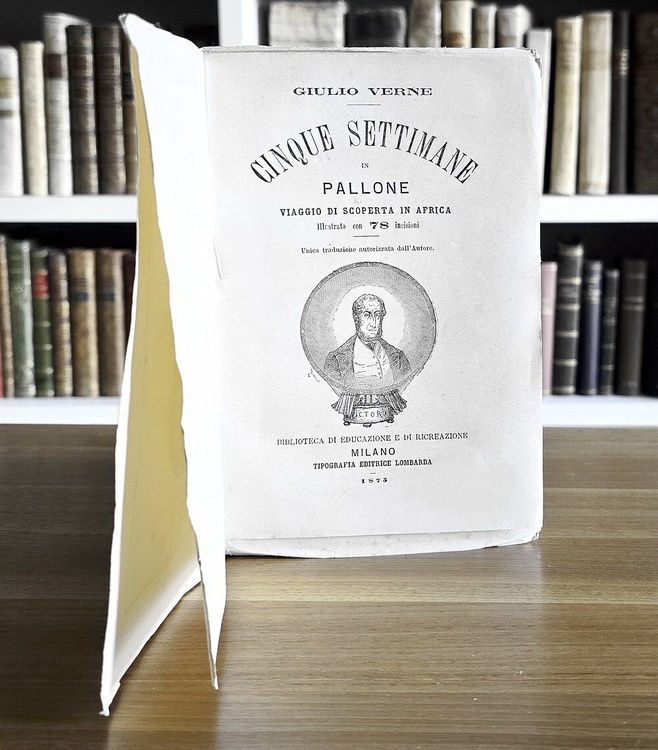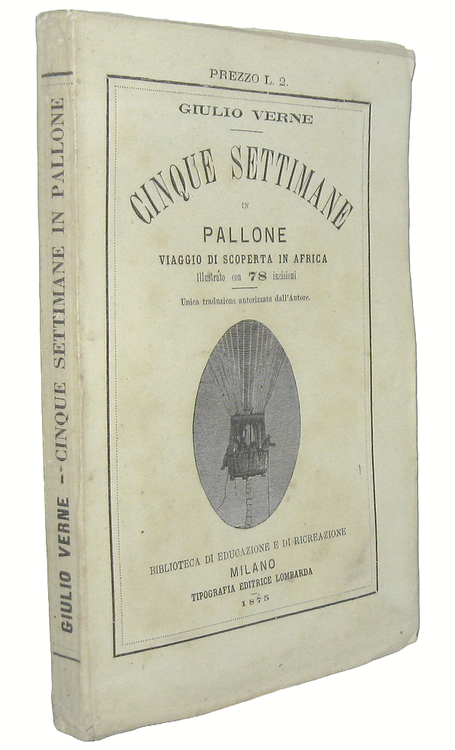 Cm. 19,5, pp. 299 (1). Con 78 belle incisioni xilografiche a illustrare il testo. Brossura editoriale (molto rara da trovarsi integra). Trascurabili segni del tempo e qualche sporadica/lieve arrossatura. Esemplare nel complesso fresco e ben conservato. Questa celebre opera (titolo originale: Cinq semaines en ballon, 1863) è un romanzo d'avventura di Jules Verne suddiviso in 43 capitoli. L'Autore inserisce sapientemente nella narrazione descrizioni tecniche, geografiche e storiche che possono fornire uno spaccato dell'esplorazione europea dell'Africa a quell'epoca. Unica traduzione italiana autorizzata dall'Autore, verosimilmente seconda edizione. Negli stessi anni uscì anche un'edizione pirata, stampata senza l'autorizzazione di Verne. Cfr. Iccu.