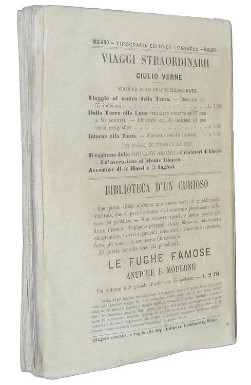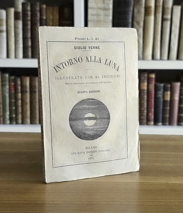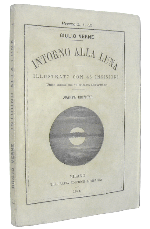 Cm. 19, pp. 202 + (2) di cat. edit. Con 45 incisioni xilografiche n.t. Brossura editoriale (molto rara da trovarsi integra). Trascurabili segni del tempo e qualche sporadica/lieve arrossatura. Esemplare nel complesso ben conservato. Intorno alla Luna (titolo originale: Autour de la Lune), è un romanzo del 1870 che fa da continuazione a Dalla Terra alla Luna del 1865, una delle più famose opere precorritrici della moderna fantascienza. Animato dalla straordinaria suspense ritrovabile in molte opere del Verne, questo romanzo prefigura un'impresa poi effettivamente realizzata, ovvero la conquista della Luna. Unica traduzione italiana autorizzata dall'Autore. Rara edizione stampata pochi anni dopo la prima traduzione italiana, peraltro non autorizzata Cfr. Iccu.