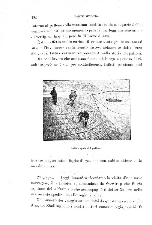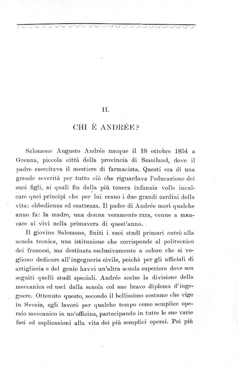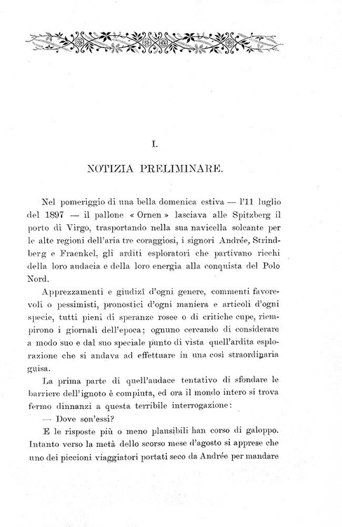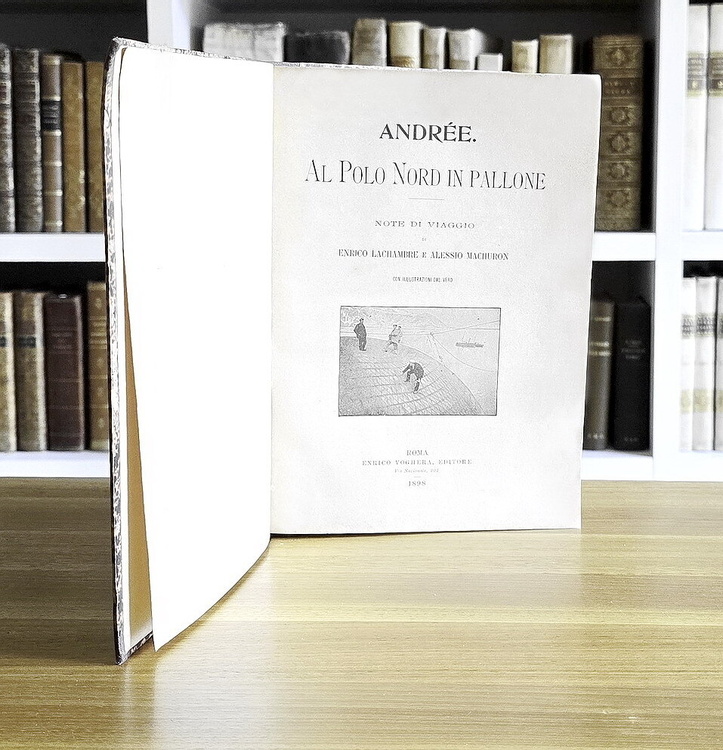 Cm. 23,5, pp. (2) vi, 220 (4). Con decine di illustrazioni fotografiche n.t. (anche a piena pagina). Legatura strettamente coeva in mezza tela con titoli in oro su tassello al dorso. Trascurabili segni del tempo. Sporadiche/lievi fioriture e ordinaria patina del tempo alle estremità delle pagine. Esemplare nel complesso genuino e ben conservato. Salomon August Andrée (1854 - 1897), ingegnere e esploratore svedese, nel 1895 ideò la traversata del Polo Nord con un pallone aerostatico libero. Il viaggio fu intrapreso nel 1897 dallo stesso Andrée insieme ai due compagni Fraenkel e Strindberg. Gli aeronauti scomparvero e non se ne ebbero più notizie fino al 1930, quando furono trovati i loro resti insieme ai documenti che permisero di ricostruire la tragedia. Non comune e ricercata prima edizione italiana. Cfr. Iccu; Boffitto, Biblioteca aeronautica, 232; Clio, IV, p. 2517.