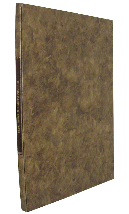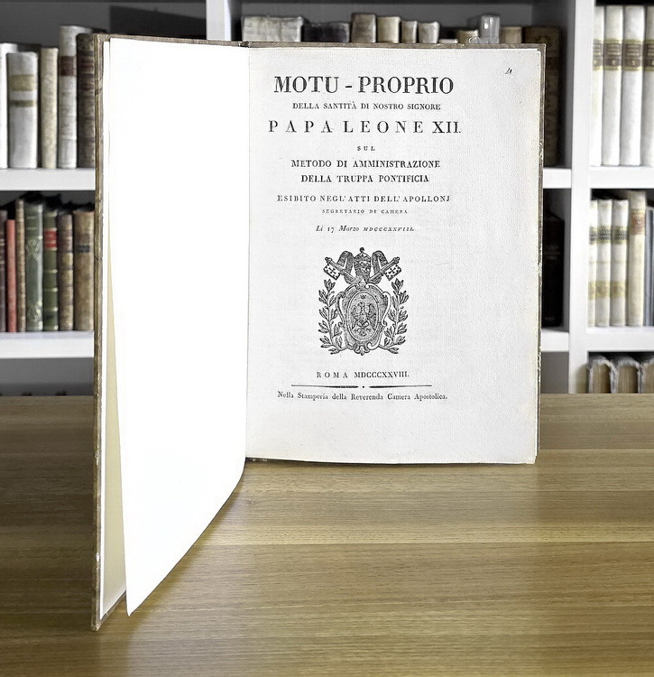 Cm. 27,5, pp. 14 + 1 c. bianca. Ex-libris “Antonio Porta” applicato al contropiatto anteriore. Antonio Porta, pseudonimo di Leo Paolazzi (Vicenza, 9 novembre 1935 – Roma, 12 aprile 1989), è stato uno scrittore, poeta e critico letterario italiano. Stemma pontificio al frontespizio. Bella legatura novecentesca in cartonato marmorizzato con titoli in oro su lungo tassello in pelle al dorso. Trascurabili/sporadiche macchiette. Esemplare nel complesso fresco e ben conservato. Motu proprio di papa Leone XII che disciplinava l'amministrazione dell'esercito pontificio. Data di emissione in calce: Dato nel nostro palazzo apostolico al Vaticano questo dì 15 Marzo 1828. Rarissima prima edizione. Cfr. Iccu che censisce solo due esemplari conservati nelle biblioteche pubbliche italiane.