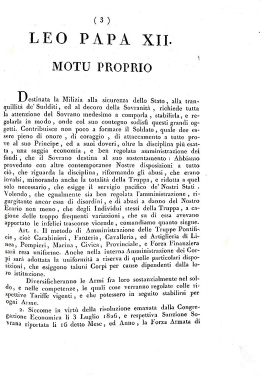 Motu-proprio della santitą di nostro signore papa LeoneXII sul metodo di amministrazione della truppa pontificia esibito negl'atti dell'Apollonj segretario di Camera li 17 marzo 1828. Roma, nella stamperia della Reverenda Camera Apostolica, 1828.