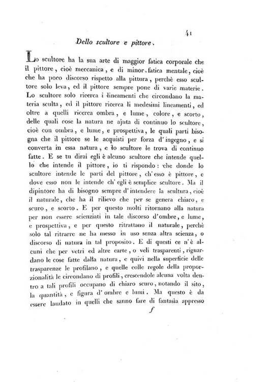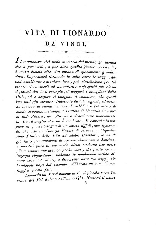 Due parti (con autonomi frontespizi) in un volume di cm. 28, pp. 43 (1) [le pagine 41-42 fascicolate tra la 36 e la 37], 511 (1); (6) + 22 tavole incise in rame da G. Cantini. Ritratto di Leonardo inciso in rame all'antiporta della seconda parte. Con all'interno una curiosa lettera manoscritta del tempo con cui si fa dono dell'opera al Cavaliere Carlo Gavardini. Legatura coeva in piena pergamena con titoli su tassello e ricchi fregi in oro al dorso. Sporadiche fioriture, più evidenti in poche pagine, peraltro esemplare fresco, marginoso e ben conservato. Parziale prima edizione, nonché settima assoluta del Trattato della Pittura di Leonardo uscito a stampa per la prima volta nel 1651 a Parigi. Quest'edizione è la prima a riprodurre l'intero Codes Urbinas Latinus 1270 della Biblioteca Apostolica Vaticana, codice cinquecentesco composto da 944 capitoli ripresi direttamente da 18 manoscritti leonardeschi in buona parte andati perduti. Per la prima volta ritroviamo cinque libri inediti fino al 1817: il primo (Paragone di pittura, poesia, musica e scultura), il quinto (Dell'ombra e lume e della prospettiva), il sesto (Degli alberi e verdure), il settimo (Della natura delli nuvoli) e infine l'ottavo (Dell'orizzonte). Cfr. Iccu; Brunet, V, 1258; Gamba, 1167; Cicognara, 237.