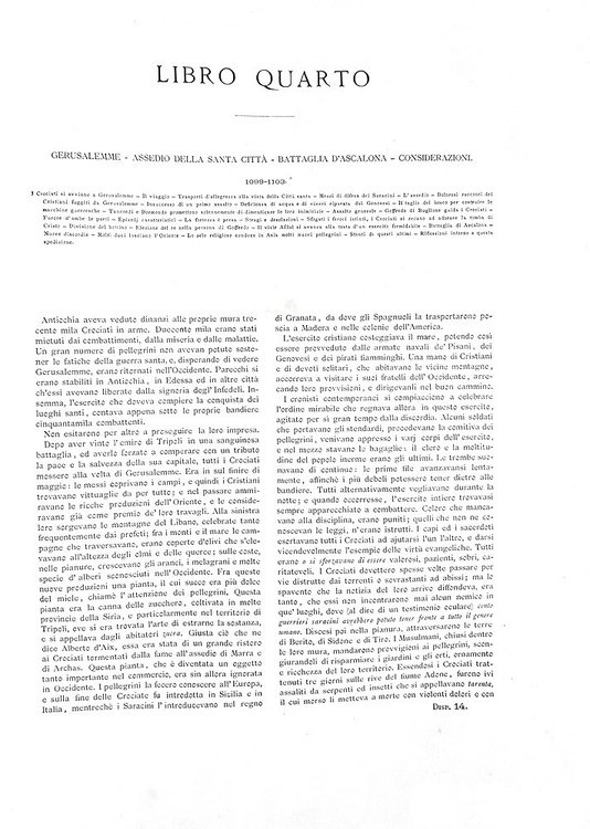 Cm. 43, pp. 408. Con 100 bellissime tavole xilografiche a piena pagina di Gustave Doré. Legatura strettamente coeva in mezza pelle nera con titoli e filetti in oro al dorso. Lievi e inevitabili (data la gran mole del volume il cui peso è di circa 6 kg) tracce d'uso alla legatura e marginali fioriture dovute alla qualità della carta (più evidenti nelle pagine iniziali e finali). Esemplare nel complesso genuino e in buono stato di conservazione. Rara e ricercata prima edizione nella celebre interpretazione figurativa ad opera di Gustave Doré, che si distingue dalle numerose edizioni successive per il formato più grande, la differente paginazione, la qualità di carta e la nitidezza delle incisioni. L'editio princeps in francese fu stampata a Parigi nel 1875. Doré fu uno straordinario illustratore, nato a Strasburgo il 6 gennaio 1832 e morto a Parigi il 23 gennaio 1883; è considerato uno degli illustratori di libri più prolifici e di maggior successo del tardo diciannovesimo secolo. Joseph Francois Michaud (1767- 1839), storico e letterato francese, è ancora oggi ricordato per questa fortunata e popolare opera sulle Crociate stampata per la prima volta in francese nel 1813-1822. Cfr. Iccu e per le edizioni francesi Brunet, III, 1698; Graesse, 512.