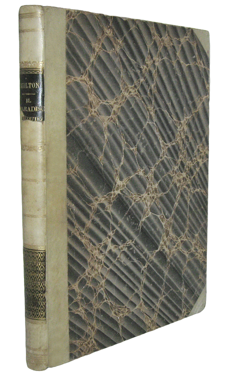 Cm. 34, pp. xii, 282 (2). Con 50 bellissime illustrazioni di Gustave Dorè a piena pagina. Stampato su due colonne. Piatto anteriore della brossura originale ben preservato e fascicolato all'inizio del libro. Legatura strettamente coeva in mezza pergamena con titoli su doppio tassello e filetti in oro al dorso. Trascurabili segni del tempo alla legatura, lievi e naturali arrossature/bruniture (tipiche della carta usata per le edizioni Sonzogno di questa epoca). Esemplare nel complesso genuino e ben conservato. Celebre illustrata da Doré del Paradiso perduto del grande poeta, scrittore, filosofo, saggista, statista e teologo londinese John Milton (1608-1674). Le magnifiche illustrazioni si devono al grande artista e incisore francese Gustave Doré (1832-1883),considerato a ragione l'illustratore più importante dell'Ottocento. Verosimilmente seconda edizione italiana (la dicitura al frontespizio di "edizione economica" è riferita solo al fatto che l'edizione uscì a dispense). Cfr. Iccu.