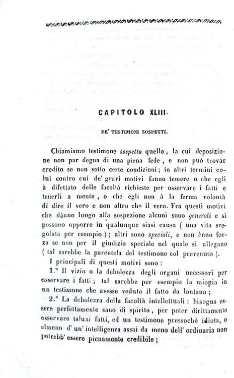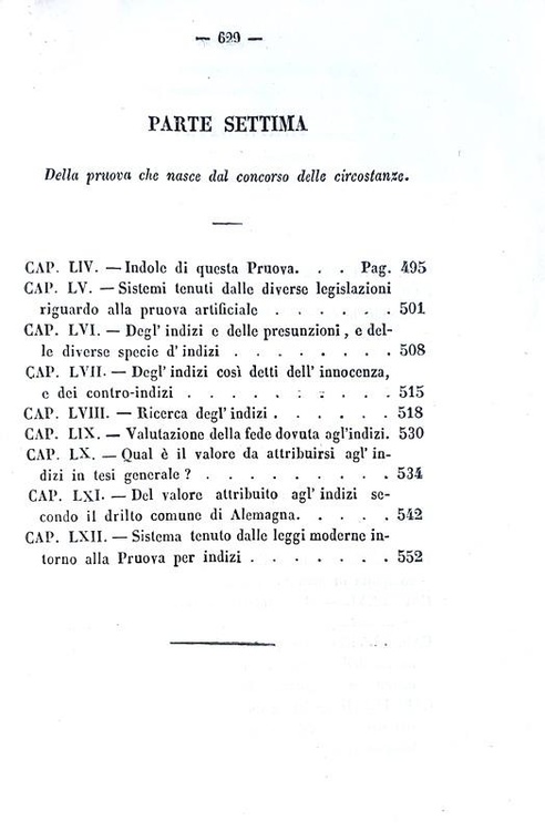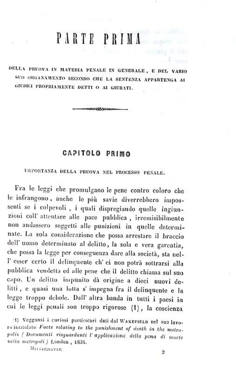 Cm. 21, pp. 631 (1). Graziosa legatura coeva in piena pergamena con titoli su doppio tassello e fregi in oro al dorso. Sporadiche e trascurabili fioriture. Esemplare nel complesso fresco e ben conservato. Karl Joseph Anton Mittermaier (1787-1867), tedesco, fu celebre giurista e uomo di Stato. Professore a Landshut, Bonn ed Heidelberg, fu in seguito presidente del Parlamento e partecipò alla compilazione della costituzione liberale dell'Impero. Fondamentale saggio sulla prova nel processo penale. Non comune e ricercato. Rara prima edizione italiana seguita nel 1858 dall'altra versione milanese, anch'essa originale, curata da Ambrosoli. Cfr. Iccu.