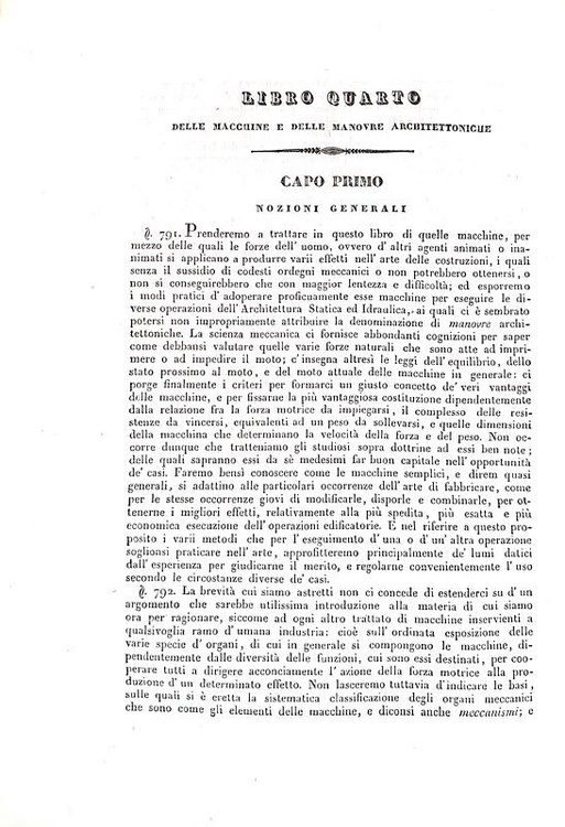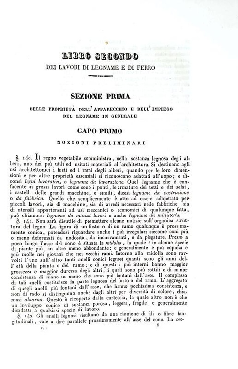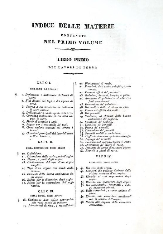 Tre parti in due volumi di cm. 29; pp. 430 (10); (26) 279 (9) [la seconda parte è rilegata in testa al primo volume; le tavole sono raccolte in un volume autonomo]. Con 68 (36+32) belle tavole incise in rame fuori testo, talvolta ripiegate [ldue distinte tavole sono numerate 26 nella prima parte] . Elegante legatura coeva in mezza pelle con titoli e filetti in oro al dorso e carta marmorizzata ai piatti. Piccola menda al dorso del secondo volume, qualche piccolo restauro marginale a poche carte. Esemplare ottimamente conservato, marginoso con carte particolarmente fresche. Nicola Cavalieri (1788-1867), matematico e ingegnere idraulico nativo di Civitavecchia, insegnò nell'Archiginnasio romano, dove fu tra i fondatori della Scuola degli Ingegneri. Non comune seconda edizione (la prima è del 1826) di questo celebre trattato di architettura. Il primo volume tratta dei lavori di terra: costruzione, difesa e riparazione degli argini; forma, struttura e pertinenze delle strade; lavori in legname con descrizione delle diverse proprietà/caratteristiche (taglio, dimensioni, denominazioni, trasporto, conservazione, incurvamento artificiale, collocamento, congiunzioni, preservazione); ponti; dighe. Il secondo tratta dei lavori murali: pietre naturali e artefatte; volte; intonachi e pavimenti; sostegni; costruzioni marittime; macchine e manovre architettoniche; stime; occupazione di terreni campestri e fabbriche. Cfr. Iccu; Graesse, II, 92; Brunet, I, 1695.